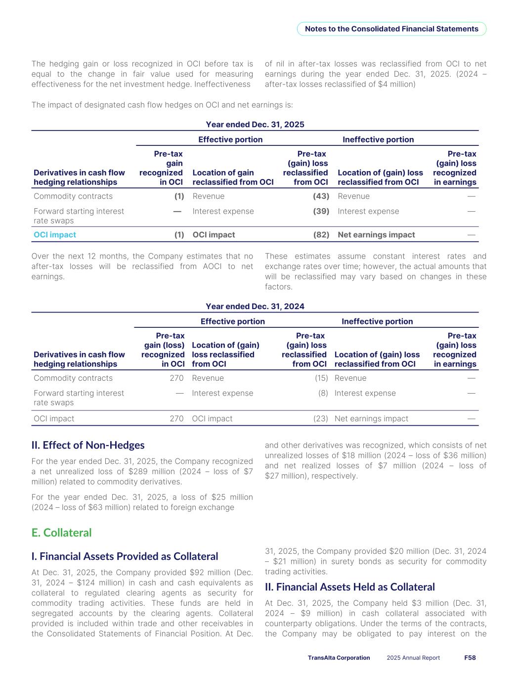 The hedging gain or loss recognized in OCI before tax is equal to the change in fair value used for measuring effectiveness for the net investment hedge. Ineffectiveness of nil in after-tax losses was reclassified from OCI to net earnings during the year ended Dec. 31, 2025. (2024 – after-tax losses reclassified of $4 million) The impact of designated cash flow hedges on OCI and net earnings is: Year ended Dec. 31, 2025     Effective portion   Ineffective portion   Derivatives in cash flow  hedging relationships Pre-tax gain recognized in OCI Location of gain reclassified from OCI Pre-tax  (gain) loss reclassified from OCI Location of (gain) loss reclassified from OCI Pre-tax (gain) loss recognized in earnings Commodity contracts (1) Revenue (43) Revenue — Forward starting interest rate swaps — Interest expense (39) Interest expense — OCI impact (1) OCI impact (82) Net earnings impact — Over the next 12 months, the Company estimates that no after-tax losses will be reclassified from AOCI to net earnings. These estimates assume constant interest rates and exchange rates over time; however, the actual amounts that will be reclassified may vary based on changes in these factors. Year ended Dec. 31, 2024     Effective portion   Ineffective portion   Derivatives in cash flow  hedging relationships Pre-tax gain (loss) recognized in OCI Location of (gain)  loss reclassified from OCI Pre-tax  (gain) loss reclassified from OCI Location of (gain) loss reclassified from OCI Pre-tax (gain) loss recognized  in earnings Commodity contracts 270 Revenue (15) Revenue — Forward starting interest rate swaps — Interest expense (8) Interest expense — OCI impact 270 OCI impact (23) Net earnings impact — II. Effect of Non-Hedges For the year ended Dec. 31, 2025, the Company recognized a net unrealized loss of $289 million (2024 – loss of $7 million) related to commodity derivatives. For the year ended Dec. 31, 2025, a loss of $25  million (2024 – loss of $63 million) related to foreign exchange and other derivatives was recognized, which consists of net unrealized losses of $18 million (2024 – loss of $36 million) and net realized losses of $7  million (2024 – loss of $27 million), respectively. E. Collateral I. Financial Assets Provided as Collateral At Dec. 31, 2025, the Company provided $92 million (Dec. 31, 2024 – $124 million) in cash and cash equivalents as collateral to regulated clearing agents as security for commodity trading activities. These funds are held in segregated accounts by the clearing agents. Collateral provided is included within trade and other receivables in the Consolidated Statements of Financial Position. At Dec. 31, 2025, the Company provided $20 million (Dec. 31, 2024 – $21 million) in surety bonds as security for commodity trading activities. II. Financial Assets Held as Collateral At Dec. 31, 2025, the Company held $3  million (Dec. 31, 2024 – $9 million) in cash collateral associated with counterparty obligations. Under the terms of the contracts, the Company may be obligated to pay interest on the TransAlta Corporation 2025 Annual Report F58
