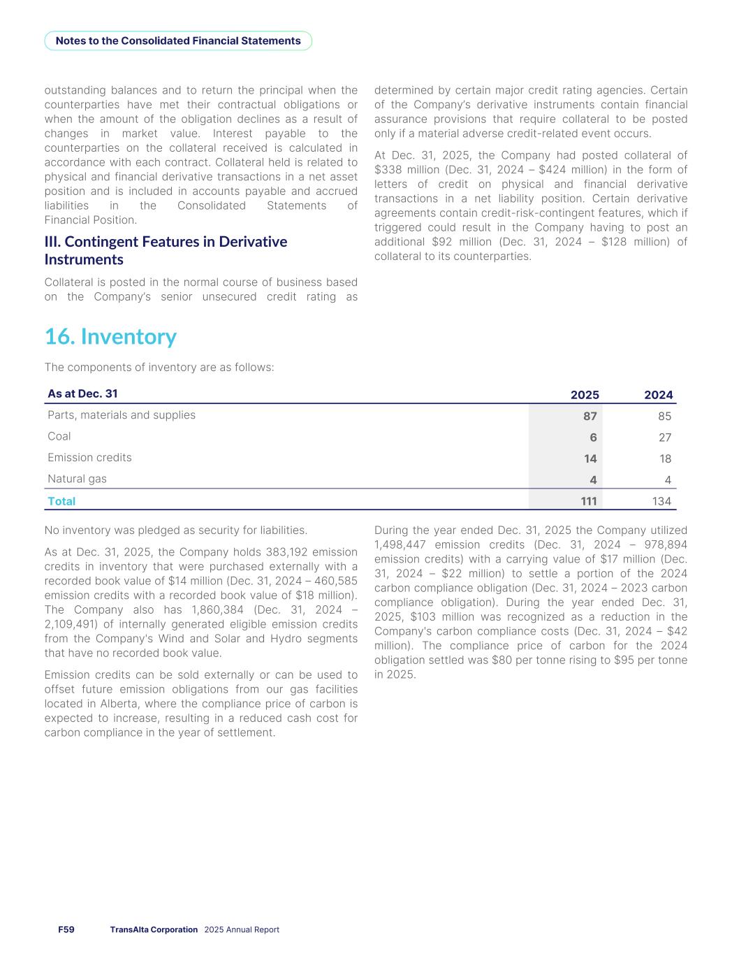 outstanding balances and to return the principal when the counterparties have met their contractual obligations or when the amount of the obligation declines as a result of changes in market value. Interest payable to the counterparties on the collateral received is calculated in accordance with each contract. Collateral held is related to physical and financial derivative transactions in a net asset position and is included in accounts payable and accrued liabilities in the Consolidated Statements of Financial Position. III. Contingent Features in Derivative Instruments Collateral is posted in the normal course of business based on the Company’s senior unsecured credit rating as determined by certain major credit rating agencies. Certain of the Company’s derivative instruments contain financial assurance provisions that require collateral to be posted only if a material adverse credit-related event occurs. At Dec. 31, 2025, the Company had posted collateral of $338 million (Dec. 31, 2024 – $424 million) in the form of letters of credit on physical and financial derivative transactions in a net liability position.  Certain derivative agreements contain credit-risk-contingent features, which if triggered could result in the Company having to post an additional $92 million (Dec. 31, 2024 – $128 million) of collateral to its counterparties. 16. Inventory The components of inventory are as follows: As at Dec. 31 2025 2024 Parts, materials and supplies 87 85 Coal 6 27 Emission credits 14 18 Natural gas 4 4 Total 111 134 No inventory was pledged as security for liabilities. As at Dec. 31, 2025, the Company holds 383,192 emission credits in inventory that were purchased externally with a recorded book value of $14 million (Dec. 31, 2024 – 460,585 emission credits with a recorded book value of $18 million). The Company also has 1,860,384 (Dec. 31, 2024 – 2,109,491) of internally generated eligible emission credits from the Company's Wind and Solar and Hydro segments that have no recorded book value. Emission credits can be sold externally or can be used to offset future emission obligations from our gas facilities located in Alberta, where the compliance price of carbon is expected to increase, resulting in a reduced cash cost for carbon compliance in the year of settlement. During the year ended Dec. 31, 2025 the Company utilized 1,498,447 emission credits (Dec. 31, 2024 – 978,894 emission credits) with a carrying value of $17 million (Dec. 31, 2024 – $22 million) to settle a portion of the 2024 carbon compliance obligation (Dec. 31, 2024 – 2023 carbon compliance obligation). During the year ended Dec. 31, 2025, $103 million was recognized as a reduction in the Company's carbon compliance costs (Dec. 31, 2024 – $42 million). The compliance price of carbon for the 2024 obligation settled was $80 per tonne rising to $95 per tonne in 2025. F59 TransAlta Corporation 2025 Annual Report