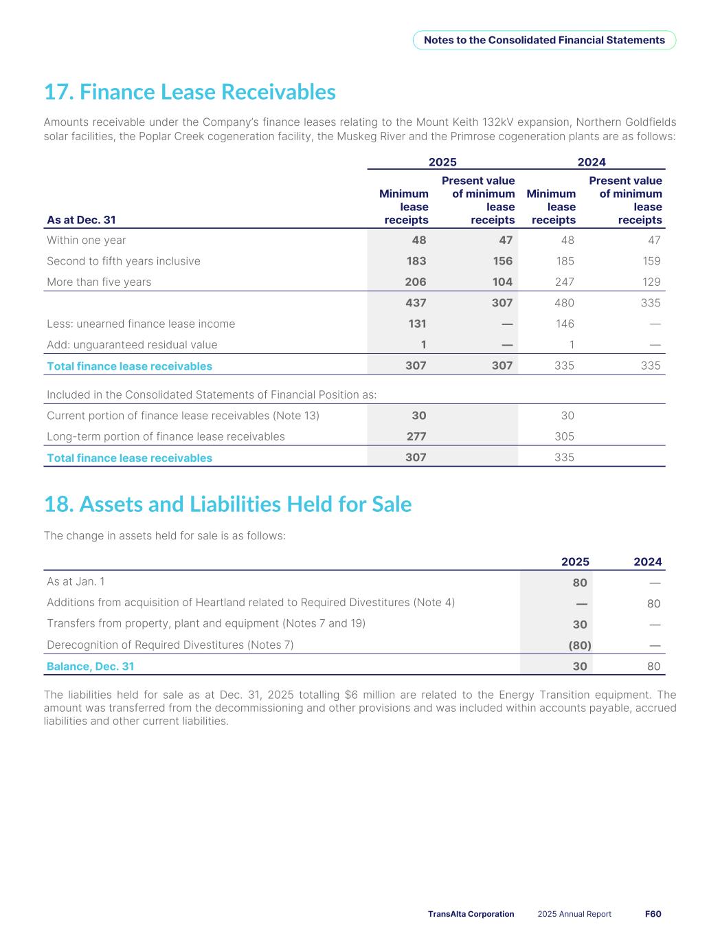 17. Finance Lease Receivables Amounts receivable under the Company’s finance leases relating to the Mount Keith 132kV expansion, Northern Goldfields solar facilities, the Poplar Creek cogeneration facility, the Muskeg River and the Primrose cogeneration plants are as follows: As at Dec. 31 2025 2024 Minimum lease receipts Present value of minimum lease receipts Minimum lease receipts Present value of minimum lease receipts Within one year 48 47 48 47 Second to fifth years inclusive 183 156 185 159 More than five years 206 104 247 129   437 307 480 335 Less: unearned finance lease income 131 — 146 — Add: unguaranteed residual value 1 — 1 — Total finance lease receivables 307 307 335 335 Included in the Consolidated Statements of Financial Position as:       Current portion of finance lease receivables (Note 13) 30   30   Long-term portion of finance lease receivables 277   305   Total finance lease receivables 307   335   18. Assets and Liabilities Held for Sale The change in assets held for sale is as follows: 2025 2024 As at Jan. 1 80 — Additions from acquisition of Heartland related to Required Divestitures (Note 4) — 80 Transfers from property, plant and equipment (Notes 7 and 19) 30 — Derecognition of Required Divestitures (Notes 7) (80) — Balance, Dec. 31 30 80 The liabilities held for sale as at Dec. 31, 2025 totalling $6 million are related to the Energy Transition equipment. The amount was transferred from the decommissioning and other provisions and was included within accounts payable, accrued liabilities and other current liabilities. TransAlta Corporation 2025 Annual Report F60
