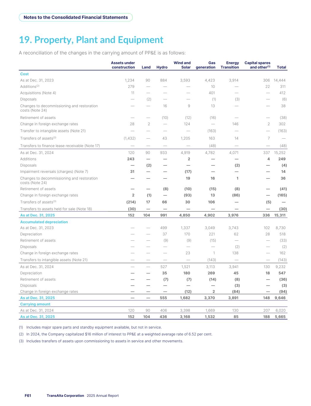 19. Property, Plant and Equipment A reconciliation of the changes in the carrying amount of PP&E is as follows:   Assets under construction Land Hydro Wind and Solar Gas generation Energy Transition Capital spares and other(1) Total Cost               As at Dec. 31, 2023 1,234 90 884 3,593 4,423 3,914 306 14,444 Additions(2) 279 — — — 10 — 22 311 Acquisitions (Note 4) 11 — — — 401 — — 412 Disposals — (2) — — (1) (3) — (6) Changes to decommissioning and restoration costs (Note 24) — — 16 9 13 — — 38 Retirement of assets — — (10) (12) (16) — — (38) Change in foreign exchange rates 28 2 — 124 — 146 2 302 Transfer to intangible assets (Note 21) — — — — (163) — — (163) Transfers of assets(3) (1,432) — 43 1,205 163 14 7 — Transfers to finance lease receivable (Note 17) — — — — (48) — — (48) As at Dec. 31, 2024 120 90 933 4,919 4,782 4,071 337 15,252 Additions 243 — — 2 — — 4 249 Disposals — (2) — — — (2) — (4) Impairment reversals (charges) (Note 7) 31 — — (17) — — — 14 Changes to decommissioning and restoration costs (Note 24) — — — 19 16 1 — 36 Retirement of assets — — (8) (10) (15) (8) — (41) Change in foreign exchange rates 2 (1) — (93) 13 (86) — (165) Transfers of assets(3) (214) 17 66 30 106 — (5) — Transfers to assets held for sale (Note 18) (30) — — — — — — (30) As at Dec. 31, 2025 152 104 991 4,850 4,902 3,976 336 15,311 Accumulated depreciation As at Dec. 31, 2023 — — 499 1,337 3,049 3,743 102 8,730 Depreciation — — 37 170 221 62 28 518 Retirement of assets — — (9) (9) (15) — — (33) Disposals — — — — — (2) — (2) Change in foreign exchange rates — — — 23 1 138 — 162 Transfers to intangible assets (Note 21) — — — — (143) — — (143) As at Dec. 31, 2024 — — 527 1,521 3,113 3,941 130 9,232 Depreciation — — 35 180 269 45 18 547 Retirement of assets — — (7) (7) (14) (8) — (36) Disposals — — — — — (3) — (3) Change in foreign exchange rates — — — (12) 2 (84) — (94) As at Dec. 31, 2025 — — 555 1,682 3,370 3,891 148 9,646 Carrying amount               As at Dec. 31, 2024 120 90 406 3,398 1,669 130 207 6,020 As at Dec. 31, 2025 152 104 436 3,168 1,532 85 188 5,665 (1) Includes major spare parts and standby equipment available, but not in service. (2) In 2024, the Company capitalized $16 million of interest to PP&E at a weighted average rate of 6.52 per cent. (3) Includes transfers of assets upon commissioning to assets in service and other movements. F61 TransAlta Corporation 2025 Annual Report