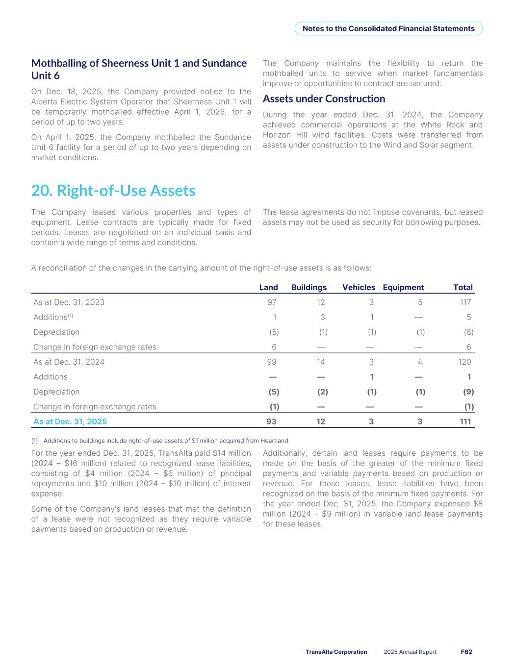 Mothballing of Sheerness Unit 1 and Sundance Unit 6 On Dec. 18, 2025, the Company provided notice to the Alberta Electric System Operator that Sheerness Unit 1 will be temporarily mothballed effective April 1, 2026, for a period of up to two years. On April 1, 2025, the Company mothballed the Sundance Unit 6 facility for a period of up to two years depending on market conditions. The Company maintains the flexibility to return the mothballed units to service when market fundamentals improve or opportunities to contract are secured. Assets under Construction During the year ended Dec. 31, 2024, the Company achieved commercial operations at the White Rock and Horizon Hill wind facilities. Costs were transferred from assets under construction to the Wind and Solar segment. 20. Right-of-Use Assets The Company leases various properties and types of equipment. Lease contracts are typically made for fixed periods. Leases are negotiated on an individual basis and contain a wide range of terms and conditions. The lease agreements do not impose covenants, but leased assets may not be used as security for borrowing purposes. A reconciliation of the changes in the carrying amount of the right-of-use assets is as follows: Land Buildings Vehicles Equipment Total As at Dec. 31, 2023 97 12 3 5 117 Additions(1) 1 3 1 — 5 Depreciation (5) (1) (1) (1) (8) Change in foreign exchange rates 6 — — — 6 As at Dec. 31, 2024 99 14 3 4 120 Additions — — 1 — 1 Depreciation (5) (2) (1) (1) (9) Change in foreign exchange rates (1) — — — (1) As at Dec. 31, 2025 93 12 3 3 111 (1) Additions to buildings include right-of-use assets of $1 million acquired from Heartland. For the year ended Dec. 31, 2025, TransAlta paid $14 million (2024 – $16 million) related to recognized lease liabilities, consisting of $4  million (2024 – $6 million) of principal repayments and $10 million (2024 – $10 million) of interest expense. Some of the Company's land leases that met the definition of a lease were not recognized as they require variable payments based on production or revenue. Additionally, certain land leases require payments to be made on the basis of the greater of the minimum fixed payments and variable payments based on production or revenue. For these leases, lease liabilities have been recognized on the basis of the minimum fixed payments. For the year ended Dec. 31, 2025, the Company expensed $8 million (2024 – $9 million) in variable land lease payments for these leases. TransAlta Corporation 2025 Annual Report F62
