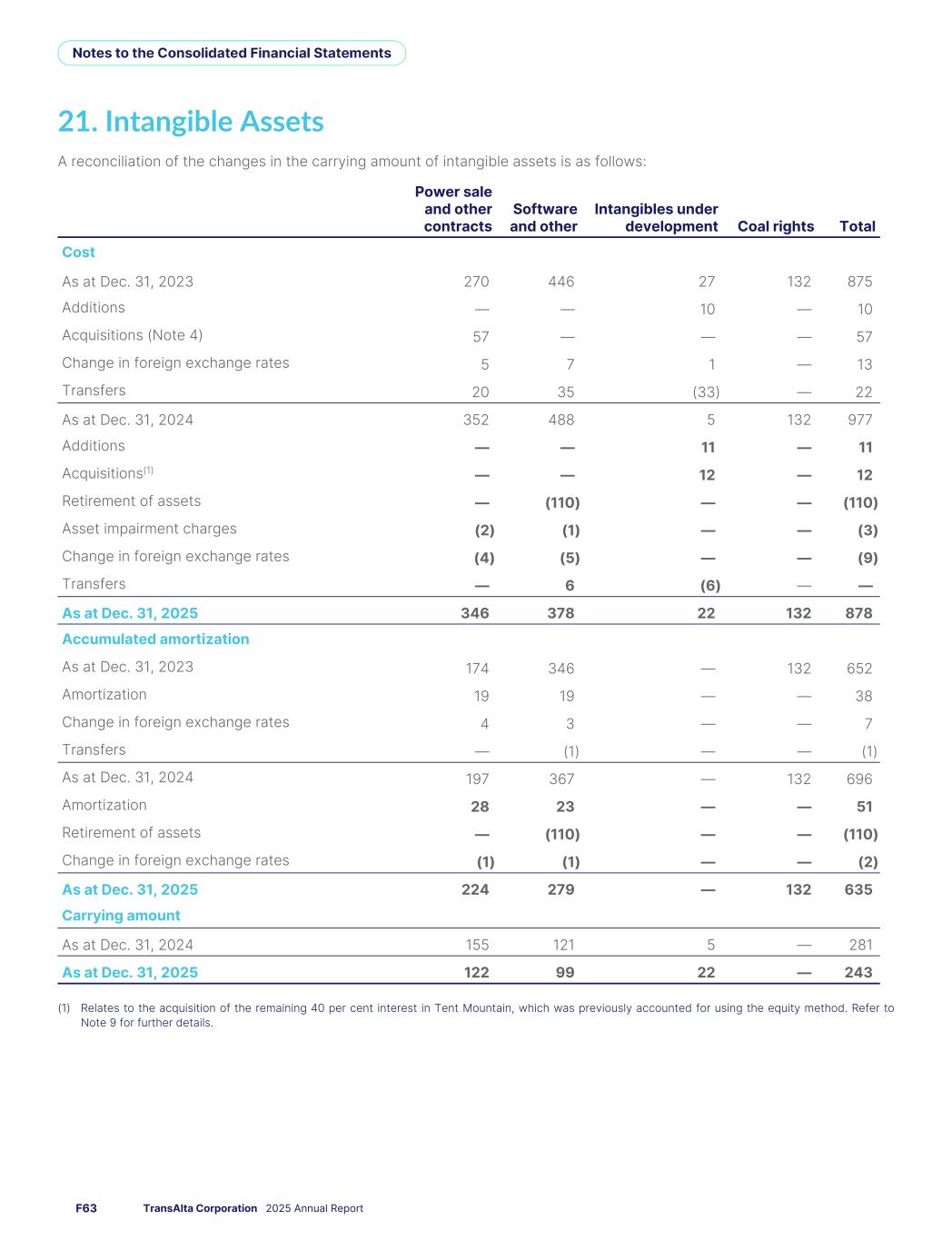 21. Intangible Assets A reconciliation of the changes in the carrying amount of intangible assets is as follows:   Power sale and other contracts Software and other Intangibles under development Coal rights Total Cost           As at Dec. 31, 2023 270 446 27 132 875 Additions — — 10 — 10 Acquisitions (Note 4) 57 — — — 57 Change in foreign exchange rates 5 7 1 — 13 Transfers 20 35 (33) — 22 As at Dec. 31, 2024 352 488 5 132 977 Additions — — 11 — 11 Acquisitions(1) — — 12 — 12 Retirement of assets — (110) — — (110) Asset impairment charges (2) (1) — — (3) Change in foreign exchange rates (4) (5) — — (9) Transfers — 6 (6) — — As at Dec. 31, 2025 346 378 22 132 878 Accumulated amortization As at Dec. 31, 2023 174 346 — 132 652 Amortization 19 19 — — 38 Change in foreign exchange rates 4 3 — — 7 Transfers — (1) — — (1) As at Dec. 31, 2024 197 367 — 132 696 Amortization 28 23 — — 51 Retirement of assets — (110) — — (110) Change in foreign exchange rates (1) (1) — — (2) As at Dec. 31, 2025 224 279 — 132 635 Carrying amount           As at Dec. 31, 2024 155 121 5 — 281 As at Dec. 31, 2025 122 99 22 — 243 (1) Relates to the acquisition of the remaining 40 per cent interest in Tent Mountain, which was previously accounted for using the equity method. Refer to Note 9 for further details. F63 TransAlta Corporation 2025 Annual Report
