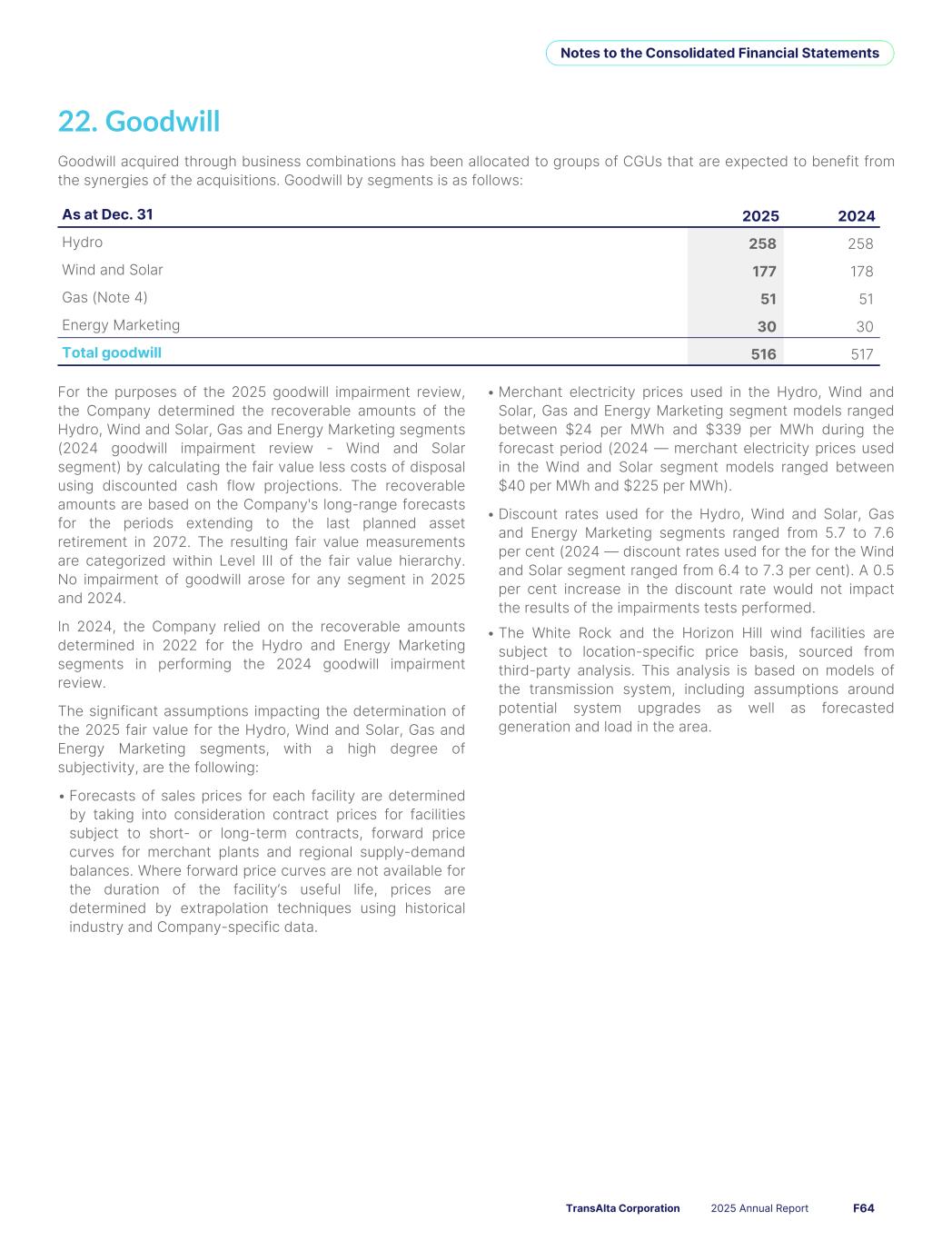 22. Goodwill Goodwill acquired through business combinations has been allocated to groups of CGUs that are expected to benefit from the synergies of the acquisitions. Goodwill by segments is as follows: As at Dec. 31 2025 2024 Hydro 258 258 Wind and Solar 177 178 Gas (Note 4) 51 51 Energy Marketing 30 30 Total goodwill 516 517 For the purposes of the 2025 goodwill impairment review, the Company determined the recoverable amounts of the Hydro, Wind and Solar, Gas and Energy Marketing segments (2024 goodwill impairment review - Wind and Solar segment) by calculating the fair value less costs of disposal using discounted cash flow projections. The recoverable amounts are based on the Company's long-range forecasts for the periods extending to the last planned asset retirement in 2072. The resulting fair value measurements are categorized within Level III of the fair value hierarchy. No impairment of goodwill arose for any segment in 2025 and 2024. In 2024, the Company relied on the recoverable amounts determined in 2022 for the Hydro and Energy Marketing segments in performing the 2024 goodwill impairment review. The significant assumptions impacting the determination of the 2025 fair value for the Hydro, Wind and Solar, Gas and Energy Marketing segments, with a high degree of subjectivity, are the following: • Forecasts of sales prices for each facility are determined by taking into consideration contract prices for facilities subject to short- or long-term contracts, forward price curves for merchant plants and regional supply-demand balances. Where forward price curves are not available for the duration of the facility’s useful life, prices are determined by extrapolation techniques using historical industry and Company-specific data. • Merchant electricity prices used in the Hydro, Wind and Solar, Gas and Energy Marketing segment models ranged between $24 per MWh and $339 per MWh during the forecast period (2024 — merchant electricity prices used in the Wind and Solar segment models ranged between $40 per MWh and $225 per MWh). • Discount rates used for the Hydro, Wind and Solar, Gas and Energy Marketing segments ranged from 5.7 to 7.6 per cent (2024 — discount rates used for the for the Wind and Solar segment ranged from 6.4 to 7.3 per cent). A 0.5 per cent increase in the discount rate would not impact the results of the impairments tests performed. • The White Rock and the Horizon Hill wind facilities are subject to location-specific price basis, sourced from third-party analysis. This analysis is based on models of the transmission system, including assumptions around potential system upgrades as well as forecasted generation and load in the area. TransAlta Corporation 2025 Annual Report F64