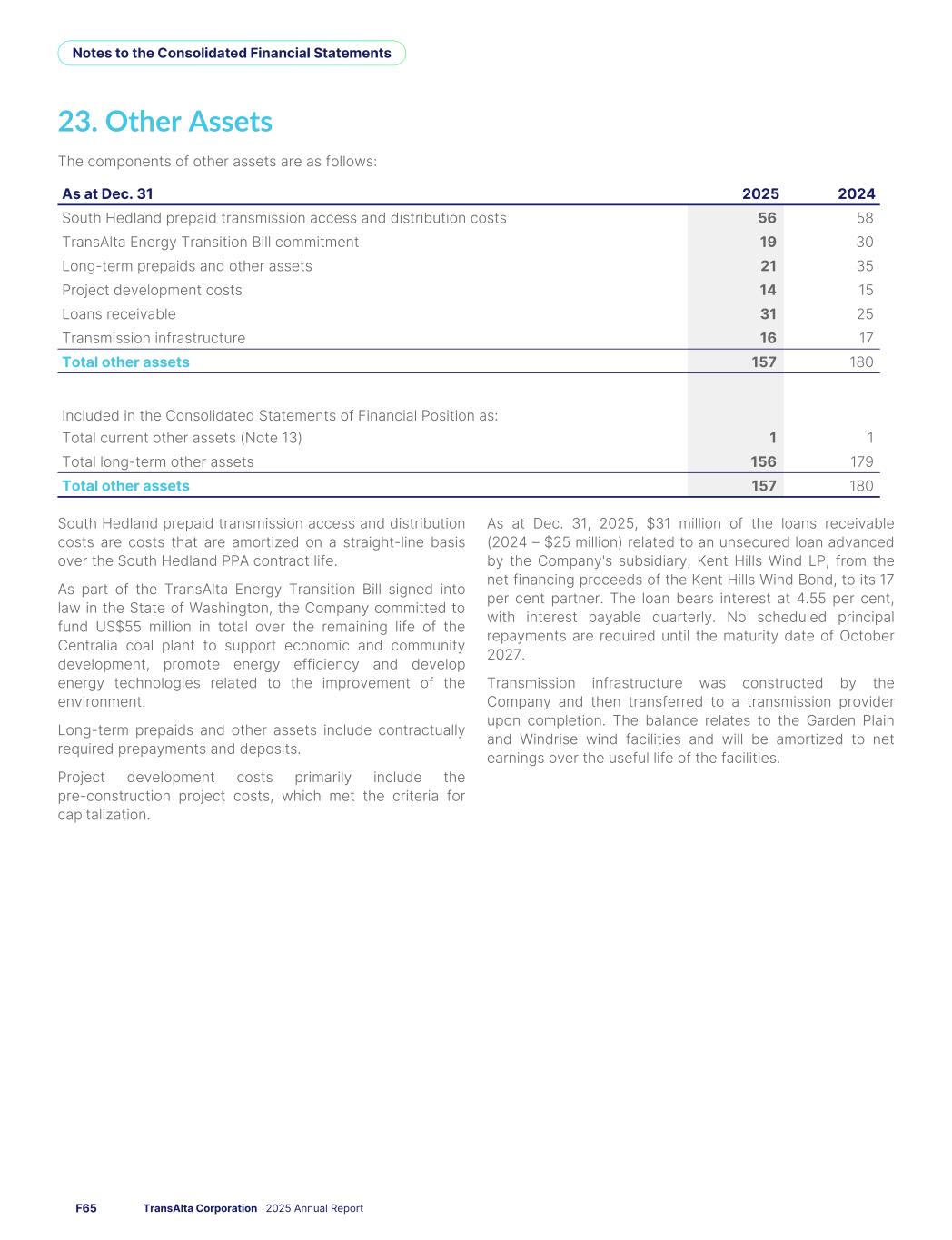 23. Other Assets The components of other assets are as follows: As at Dec. 31 2025 2024 South Hedland prepaid transmission access and distribution costs 56 58 TransAlta Energy Transition Bill commitment 19 30 Long-term prepaids and other assets 21 35 Project development costs 14 15 Loans receivable 31 25 Transmission infrastructure 16 17 Total other assets 157 180 Included in the Consolidated Statements of Financial Position as: Total current other assets (Note 13) 1 1 Total long-term other assets 156 179 Total other assets 157 180 South Hedland prepaid transmission access and distribution costs are costs that are amortized on a straight-line basis over the South Hedland PPA contract life. As part of the TransAlta Energy Transition Bill signed into law in the State of Washington, the Company committed to fund US$55 million in total over the remaining life of the Centralia coal plant to support economic and community development, promote energy efficiency and develop energy technologies related to the improvement of the environment. Long-term prepaids and other assets include contractually required prepayments and deposits. Project development costs primarily include the pre-construction project costs, which met the criteria for capitalization. As at Dec. 31, 2025, $31 million of the loans receivable (2024 – $25 million) related to an unsecured loan advanced by the Company's subsidiary, Kent Hills Wind LP, from the net financing proceeds of the Kent Hills Wind Bond, to its 17 per cent partner. The loan bears interest at 4.55 per cent, with interest payable quarterly. No scheduled principal repayments are required until the maturity date of October 2027. Transmission infrastructure was constructed by the Company and then transferred to a transmission provider upon completion. The balance relates to the Garden Plain and Windrise wind facilities and will be amortized to net earnings over the useful life of the facilities. F65 TransAlta Corporation 2025 Annual Report