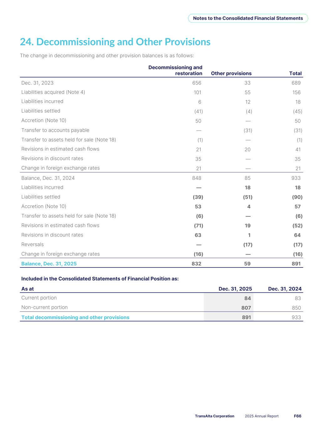 24. Decommissioning and Other Provisions The change in decommissioning and other provision balances is as follows:   Decommissioning and restoration Other provisions Total Dec. 31, 2023 656 33 689 Liabilities acquired (Note 4) 101 55 156 Liabilities incurred 6 12 18 Liabilities settled (41) (4) (45) Accretion (Note 10) 50 — 50 Transfer to accounts payable — (31) (31) Transfer to assets held for sale (Note 18) (1) — (1) Revisions in estimated cash flows 21 20 41 Revisions in discount rates 35 — 35 Change in foreign exchange rates 21 — 21 Balance, Dec. 31, 2024 848 85 933 Liabilities incurred — 18 18 Liabilities settled (39) (51) (90) Accretion (Note 10) 53 4 57 Transfer to assets held for sale (Note 18) (6) — (6) Revisions in estimated cash flows (71) 19 (52) Revisions in discount rates 63 1 64 Reversals — (17) (17) Change in foreign exchange rates (16) — (16) Balance, Dec. 31, 2025 832 59 891 Included in the Consolidated Statements of Financial Position as: As at Dec. 31, 2025 Dec. 31, 2024 Current portion 84 83 Non-current portion 807 850 Total decommissioning and other provisions 891 933 TransAlta Corporation 2025 Annual Report F66