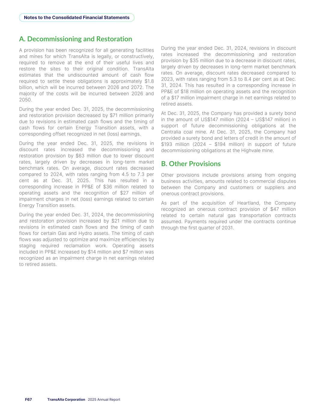 A. Decommissioning and Restoration A provision has been recognized for all generating facilities and mines for which TransAlta is legally, or constructively, required to remove at the end of their useful lives and restore the sites to their original condition. TransAlta estimates that the undiscounted amount of cash flow required to settle these obligations is approximately $1.8 billion, which will be incurred between 2026 and 2072. The majority of the costs will be incurred between 2026 and 2050. During the year ended Dec. 31, 2025, the decommissioning and restoration provision decreased by $71 million primarily due to revisions in estimated cash flows and the timing of cash flows for certain Energy Transition assets, with a corresponding offset recognized in net (loss) earnings. During the year ended Dec. 31, 2025, the revisions in discount rates increased the decommissioning and restoration provision by $63 million due to lower discount rates, largely driven by decreases in long-term market benchmark rates. On average, discount rates decreased compared to 2024, with rates ranging from 4.5 to 7.3 per cent as at Dec. 31, 2025. This has resulted in a corresponding increase in PP&E of $36 million related to operating assets and the recognition of $27 million of impairment charges in net (loss) earnings related to certain Energy Transition assets. During the year ended Dec. 31, 2024, the decommissioning and restoration provision increased by $21  million due to revisions in estimated cash flows and the timing of cash flows for certain Gas and Hydro assets. The timing of cash flows was adjusted to optimize and maximize efficiencies by staging required reclamation work. Operating assets included in PP&E increased by $14 million and $7 million was recognized as an impairment charge in net earnings related to retired assets. During the year ended Dec. 31, 2024, revisions in discount rates increased the decommissioning and restoration provision by $35 million due to a decrease in discount rates, largely driven by decreases in long-term market benchmark rates. On average, discount rates decreased compared to 2023, with rates ranging from 5.3 to 8.4 per cent as at Dec. 31, 2024. This has resulted in a corresponding increase in PP&E of $18 million on operating assets and the recognition of a $17 million impairment charge in net earnings related to retired assets. At Dec. 31, 2025, the Company has provided a surety bond in the amount of US$147 million (2024 – US$147 million) in support of future decommissioning obligations at the Centralia coal mine. At Dec. 31, 2025, the Company had provided a surety bond and letters of credit in the amount of $193 million (2024 – $194  million) in support of future decommissioning obligations at the Highvale mine. B. Other Provisions Other provisions include provisions arising from ongoing business activities, amounts related to commercial disputes between the Company and customers or suppliers and onerous contract provisions. As part of the acquisition of Heartland, the Company recognized an onerous contract provision of $47  million related to certain natural gas transportation contracts assumed. Payments required under the contracts continue through the first quarter of 2031. F67 TransAlta Corporation 2025 Annual Report