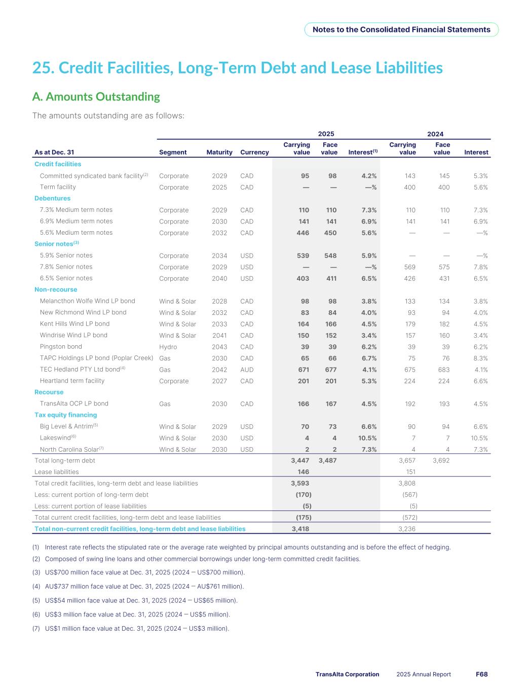 25. Credit Facilities, Long-Term Debt and Lease Liabilities A. Amounts Outstanding The amounts outstanding are as follows: As at Dec. 31 2025 2024 Segment Maturity Currency Carrying value Face value Interest(1) Carrying value Face value Interest Credit facilities Committed syndicated bank facility(2) Corporate 2029 CAD 95 98 4.2% 143 145 5.3% Term facility Corporate 2025 CAD — — —% 400 400 5.6% Debentures 7.3% Medium term notes Corporate 2029 CAD 110 110 7.3% 110 110 7.3% 6.9% Medium term notes Corporate 2030 CAD 141 141 6.9% 141 141 6.9% 5.6% Medium term notes Corporate 2032 CAD 446 450 5.6% — — —% Senior notes(3) 5.9% Senior notes Corporate 2034 USD 539 548 5.9% — — —% 7.8% Senior notes Corporate 2029 USD — — —% 569 575 7.8% 6.5% Senior notes Corporate 2040 USD 403 411 6.5% 426 431 6.5% Non-recourse Melancthon Wolfe Wind LP bond Wind & Solar 2028 CAD 98 98 3.8% 133 134 3.8% New Richmond Wind LP bond Wind & Solar 2032 CAD 83 84 4.0% 93 94 4.0% Kent Hills Wind LP bond Wind & Solar 2033 CAD 164 166 4.5% 179 182 4.5% Windrise Wind LP bond Wind & Solar 2041 CAD 150 152 3.4% 157 160 3.4% Pingston bond Hydro 2043 CAD 39 39 6.2% 39 39 6.2% TAPC Holdings LP bond (Poplar Creek) Gas 2030 CAD 65 66 6.7% 75 76 8.3% TEC Hedland PTY Ltd bond(4) Gas 2042 AUD 671 677 4.1% 675 683 4.1% Heartland term facility Corporate 2027 CAD 201 201 5.3% 224 224 6.6% Recourse TransAlta OCP LP bond Gas 2030 CAD 166 167 4.5% 192 193 4.5% Tax equity financing Big Level & Antrim(5) Wind & Solar 2029 USD 70 73 6.6% 90 94 6.6% Lakeswind(6) Wind & Solar 2030 USD 4 4 10.5% 7 7 10.5% North Carolina Solar(7) Wind & Solar 2030 USD 2 2 7.3% 4 4 7.3% Total long-term debt 3,447 3,487   3,657 3,692 Lease liabilities 146     151 Total credit facilities, long-term debt and lease liabilities 3,593     3,808 Less: current portion of long-term debt (170)     (567) Less: current portion of lease liabilities (5)     (5) Total current credit facilities, long-term debt and lease liabilities (175)     (572) Total non-current credit facilities, long-term debt and lease liabilities 3,418     3,236 (1) Interest rate reflects the stipulated rate or the average rate weighted by principal amounts outstanding and is before the effect of hedging. (2) Composed of swing line loans and other commercial borrowings under long-term committed credit facilities. (3) US$700 million face value at Dec. 31, 2025 (2024 – US$700 million). (4) AU$737 million face value at Dec. 31, 2025 (2024 – AU$761 million). (5) US$54 million face value at Dec. 31, 2025 (2024 – US$65 million). (6) US$3 million face value at Dec. 31, 2025 (2024 – US$5 million). (7) US$1 million face value at Dec. 31, 2025 (2024 – US$3 million). TransAlta Corporation 2025 Annual Report F68