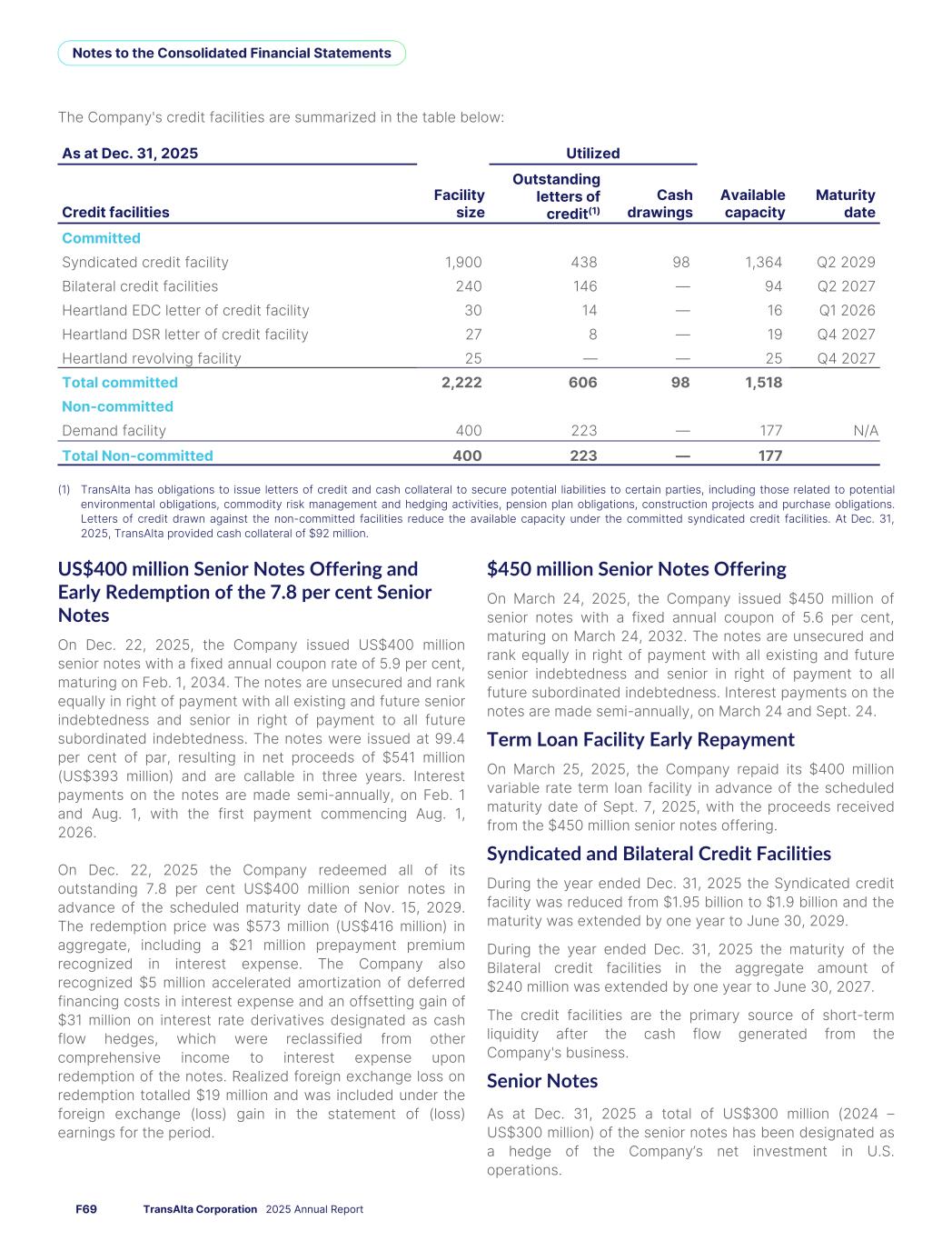 The Company's credit facilities are summarized in the table below: As at Dec. 31, 2025 Utilized Credit facilities Facility size Outstanding letters of credit(1) Cash drawings Available capacity Maturity date Committed Syndicated credit facility 1,900 438 98 1,364 Q2 2029 Bilateral credit facilities 240 146 — 94 Q2 2027 Heartland EDC letter of credit facility 30 14 — 16 Q1 2026 Heartland DSR letter of credit facility 27 8 — 19 Q4 2027 Heartland revolving facility 25 — — 25 Q4 2027 Total committed 2,222 606 98 1,518 Non-committed Demand facility 400 223 — 177 N/A Total Non-committed 400 223 — 177 (1) TransAlta has obligations to issue letters of credit and cash collateral to secure potential liabilities to certain parties, including those related to potential environmental obligations, commodity risk management and hedging activities, pension plan obligations, construction projects and purchase obligations. Letters of credit drawn against the non-committed facilities reduce the available capacity under the committed syndicated credit facilities. At Dec. 31, 2025, TransAlta provided cash collateral of $92 million. US$400 million Senior Notes Offering and Early Redemption of the 7.8 per cent Senior Notes On Dec. 22, 2025, the Company issued US$400  million senior notes with a fixed annual coupon rate of 5.9 per cent, maturing on Feb. 1, 2034. The notes are unsecured and rank equally in right of payment with all existing and future senior indebtedness and senior in right of payment to all future subordinated indebtedness. The notes were issued at 99.4 per cent of par, resulting in net proceeds of $541 million (US$393 million) and are callable in three years. Interest payments on the notes are made semi-annually, on Feb. 1 and Aug. 1, with the first payment commencing Aug. 1, 2026. On Dec. 22, 2025 the Company redeemed all of its outstanding 7.8 per cent US$400 million senior notes in advance of the scheduled maturity date of Nov. 15, 2029. The redemption price was $573 million (US$416 million) in aggregate, including a $21 million prepayment premium recognized in interest expense. The Company also recognized $5 million accelerated amortization of deferred financing costs in interest expense and an offsetting gain of $31 million on interest rate derivatives designated as cash flow hedges, which were reclassified from other comprehensive income to interest expense upon redemption of the notes. Realized foreign exchange loss on redemption totalled $19 million and was included under the foreign exchange (loss) gain in the statement of (loss) earnings for the period. $450 million Senior Notes Offering On March 24, 2025, the Company issued $450  million of senior notes with a fixed annual coupon of 5.6 per  cent, maturing on March 24, 2032. The notes are unsecured and rank equally in right of payment with all existing and future senior indebtedness and senior in right of payment to all future subordinated indebtedness. Interest payments on the notes are made semi-annually, on March 24 and Sept. 24. Term Loan Facility Early Repayment On March 25, 2025, the Company repaid its $400  million variable rate term loan facility in advance of the scheduled maturity date of Sept. 7, 2025, with the proceeds received from the $450 million senior notes offering. Syndicated and Bilateral Credit Facilities During the year ended Dec. 31, 2025 the Syndicated credit facility was reduced from $1.95 billion to $1.9 billion and the maturity was extended by one year to June 30, 2029. During the year ended Dec. 31, 2025 the maturity of the Bilateral credit facilities in the aggregate amount of $240 million was extended by one year to June 30, 2027. The credit facilities are the primary source of short-term liquidity after the cash flow generated from the Company's business. Senior Notes As at Dec. 31, 2025 a total of US$300 million (2024 – US$300 million) of the senior notes has been designated as a hedge of the Company’s net investment in U.S. operations. F69 TransAlta Corporation 2025 Annual Report