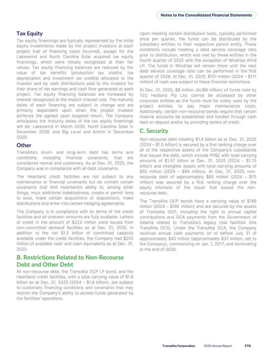 Tax Equity Tax equity financings are typically represented by the initial equity investments made by the project investors at each project (net of financing costs incurred), except for the Lakeswind and North Carolina Solar acquired tax equity financings, which were initially recognized at their fair values. Tax equity financing balances are reduced by the value of tax benefits (production tax credits, tax depreciation and investment tax credits) allocated to the investor and by cash distributions paid to the investor for their share of net earnings and cash flow generated at each project. Tax equity financing balances are increased by interest recognized at the implicit interest rate. The maturity dates of each financing are subject to change and are primarily dependent upon when the project investor achieves the agreed upon targeted return. The Company anticipates the maturity dates of the tax equity financings will be: Lakeswind in March 2030; North Carolina Solar in December 2030; and Big Level and Antrim in December 2029. Other TransAlta’s short- and long-term debt has terms and conditions, including financial covenants, that are considered normal and customary. As at Dec. 31, 2025, the Company was in compliance with all debt covenants. The Heartland credit facilities are not subject to any maintenance or financial covenants but do contain certain covenants that limit Heartland’s ability to, among other things, incur additional indebtedness, create or permit liens to exist, make certain acquisitions or dispositions, make distributions and enter into certain hedging agreements. The Company is in compliance with its terms of the credit facilities and all undrawn amounts are fully available. Letters of credit in the amount of $223 million were issued from non-committed demand facilities as at Dec. 31, 2025. In addition to the net $1.5 billion of committed capacity available under the credit facilities, the Company had $205 million of available cash and cash equivalents as at Dec. 31, 2025. B. Restrictions Related to Non-Recourse Debt and Other Debt All non-recourse debt, the TransAlta OCP LP bond, and the Heartland credit facilities, with a total carrying value of $1.6 billion as at Dec. 31, 2025 (2024 – $1.8 billion), are subject to customary financing conditions and covenants that may restrict the Company’s ability to access funds generated by the facilities’ operations. Upon meeting certain distribution tests, typically performed once per quarter, the funds can be distributed by the subsidiary entities to their respective parent entity. These conditions include meeting a debt service coverage ratio prior to distribution, which was met by these entities in the fourth quarter of 2025 with the exception of Windrise Wind LP. The funds in Windrise will remain there until the next debt service coverage ratio can be performed in the first quarter of 2026. At Dec. 31, 2025, $101 million (2024 – $117 million) of cash was subject to these financial restrictions. At Dec. 31, 2025, $8 million (AU$9 million) of funds held by TEC Hedland Pty Ltd. cannot be accessed by other corporate entities as the funds must be solely used by the project entities, to pay major maintenance costs. Additionally, certain non-recourse bonds require that certain reserve accounts be established and funded through cash held on deposit and/or by providing letters of credit. C. Security Non-recourse debt totalling $1.4 billion as at Dec. 31, 2025 (2024 – $1.5 billion) is secured by a first ranking charge over all of the respective assets of the Company’s subsidiaries that issued the debt, which include PP&E with total carrying amounts of $1.57 billion at Dec. 31, 2025 (2024 – $1.75 billion) and intangible assets with total carrying amounts of $55 million (2024 – $84 million). At Dec. 31, 2025, non- recourse debt of approximately $65 million (2024 – $75 million) was secured by a first ranking charge over the equity interests of the issuer that issued the non- recourse debt. The TransAlta OCP bonds have a carrying value of $166 million (2024 – $192 million) and are secured by the assets of TransAlta OCP, including the right to annual capital contributions and OCA payments from the Government of Alberta related to TransAlta's legacy coal facilities (the TransAlta OCA). Under the TransAlta OCA, the Company receives annual cash payments on or before July 31 of approximately $40 million (approximately $37 million, net to the Company), commencing on Jan. 1, 2017, and terminating at the end of 2030. TransAlta Corporation 2025 Annual Report F70