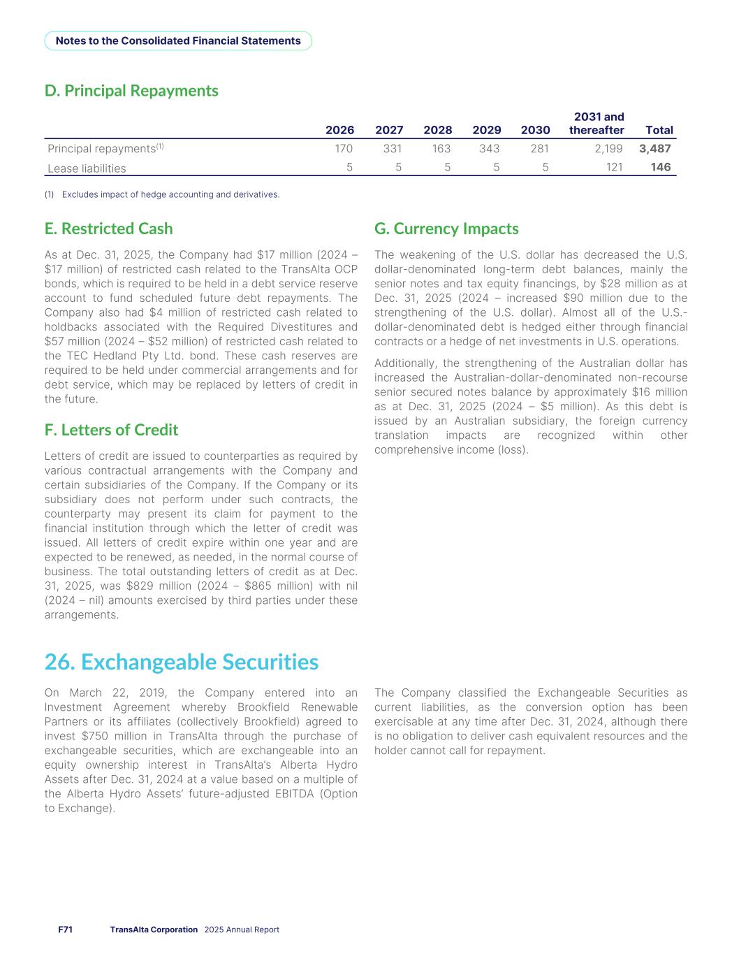 D. Principal Repayments   2026 2027 2028 2029 2030 2031 and thereafter Total Principal repayments(1) 170 331 163 343 281 2,199 3,487 Lease liabilities 5 5 5 5 5 121 146 (1) Excludes impact of hedge accounting and derivatives. E. Restricted Cash As at Dec. 31, 2025, the Company had $17 million (2024 – $17 million) of restricted cash related to the TransAlta OCP bonds, which is required to be held in a debt service reserve account to fund scheduled future debt repayments. The Company also had $4 million of restricted cash related to holdbacks associated with the Required Divestitures and $57 million (2024 – $52 million) of restricted cash related to the TEC  Hedland Pty Ltd. bond. These cash reserves are required to be held under commercial arrangements and for debt service, which may be replaced by letters of credit in the future. F. Letters of Credit Letters of credit are issued to counterparties as required by various contractual arrangements with the Company and certain subsidiaries of the Company. If the Company or its subsidiary does not perform under such contracts, the counterparty may present its claim for payment to the financial institution through which the letter of credit was issued. All letters of credit expire within one year and are expected to be renewed, as needed, in the normal course of business. The total outstanding letters of credit as at Dec. 31, 2025, was $829 million (2024 – $865 million) with nil (2024 – nil) amounts exercised by third parties under these arrangements. G. Currency Impacts The weakening of the U.S. dollar has decreased the U.S. dollar-denominated long-term debt balances, mainly the senior notes and tax equity financings, by $28 million as at Dec. 31, 2025 (2024 – increased $90  million due to the strengthening of the U.S. dollar). Almost all of the U.S.- dollar-denominated debt is hedged either through financial contracts or a hedge of net investments in U.S. operations. Additionally, the strengthening of the Australian dollar has increased the Australian-dollar-denominated non-recourse senior secured notes balance by approximately $16 million as at Dec. 31, 2025 (2024 – $5 million). As this debt is issued by an Australian subsidiary, the foreign currency translation impacts are recognized within other comprehensive income (loss). 26. Exchangeable Securities On March 22, 2019, the Company entered into an Investment Agreement whereby Brookfield Renewable Partners or its affiliates (collectively Brookfield) agreed to invest $750  million in TransAlta through the purchase of exchangeable securities, which are exchangeable into an equity ownership interest in TransAlta’s Alberta Hydro Assets after Dec. 31, 2024 at a value based on a multiple of the Alberta Hydro Assets’ future-adjusted EBITDA (Option to Exchange). The Company classified the Exchangeable Securities as current liabilities, as the conversion option has been exercisable at any time after Dec. 31, 2024, although there is no obligation to deliver cash equivalent resources and the holder cannot call for repayment. F71 TransAlta Corporation 2025 Annual Report