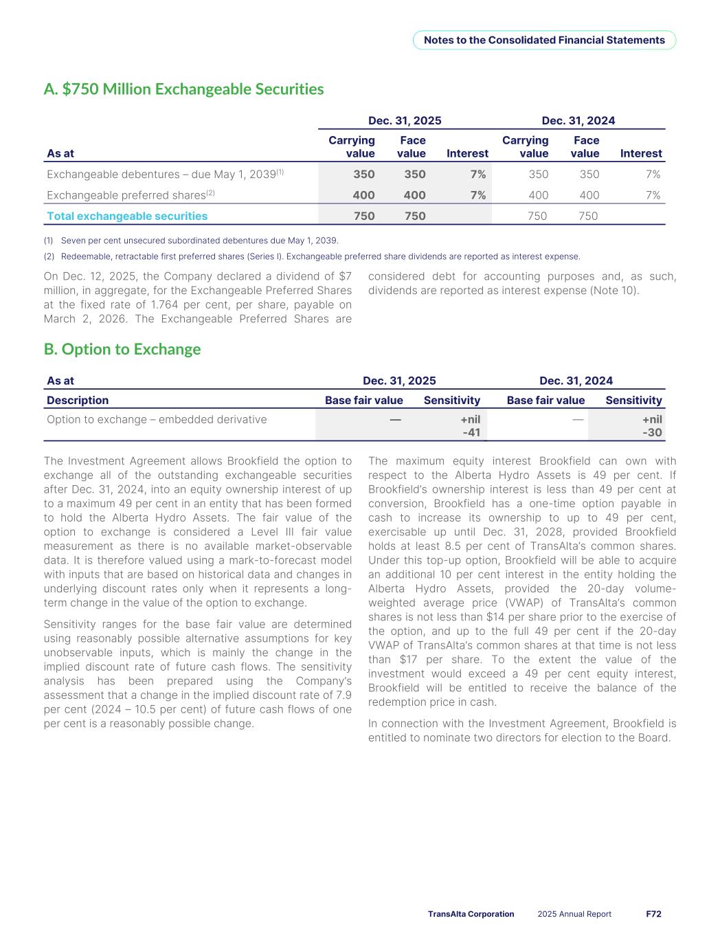 A. $750 Million Exchangeable Securities As at Dec. 31, 2025 Dec. 31, 2024 Carrying value Face value Interest Carrying value Face value Interest Exchangeable debentures – due May 1, 2039(1) 350 350 7% 350 350 7% Exchangeable preferred shares(2) 400 400 7% 400 400 7% Total exchangeable securities 750 750 750 750 (1) Seven per cent unsecured subordinated debentures due May 1, 2039. (2) Redeemable, retractable first preferred shares (Series I). Exchangeable preferred share dividends are reported as interest expense. On Dec. 12, 2025, the Company declared a dividend of $7 million, in aggregate, for the Exchangeable Preferred Shares at the fixed rate of 1.764 per cent, per share, payable on March  2, 2026. The Exchangeable Preferred Shares are considered debt for accounting purposes and, as such, dividends are reported as interest expense (Note 10). B. Option to Exchange As at Dec. 31, 2025 Dec. 31, 2024 Description Base fair value Sensitivity Base fair value Sensitivity Option to exchange – embedded derivative — +nil -41 — +nil -30 The Investment Agreement allows Brookfield the option to exchange all of the outstanding exchangeable securities after Dec. 31, 2024, into an equity ownership interest of up to a maximum 49 per cent in an entity that has been formed to hold the Alberta Hydro Assets. The fair value of the option to exchange is considered a Level III fair value measurement as there is no available market-observable data. It is therefore valued using a mark-to-forecast model with inputs that are based on historical data and changes in underlying discount rates only when it represents a long- term change in the value of the option to exchange. Sensitivity ranges for the base fair value are determined using reasonably possible alternative assumptions for key unobservable inputs, which is mainly the change in the implied discount rate of future cash flows. The sensitivity analysis has been prepared using the Company’s assessment that a change in the implied discount rate of 7.9 per cent (2024 – 10.5 per cent) of future cash flows of one per cent is a reasonably possible change. The maximum equity interest Brookfield can own with respect to the Alberta Hydro Assets is 49 per cent. If Brookfield’s ownership interest is less than 49 per cent at conversion, Brookfield has a one-time option payable in cash to increase its ownership to up to 49 per cent, exercisable up until Dec. 31, 2028, provided Brookfield holds at least 8.5 per cent of TransAlta’s common shares. Under this top-up option, Brookfield will be able to acquire an additional 10 per cent interest in the entity holding the Alberta Hydro Assets, provided the 20-day volume- weighted average price (VWAP) of TransAlta’s common shares is not less than $14 per share prior to the exercise of the option, and up to the full 49 per cent if the 20-day VWAP of TransAlta’s common shares at that time is not less than $17 per share. To the extent the value of the investment would exceed a 49 per cent equity interest, Brookfield will be entitled to receive the balance of the redemption price in cash. In connection with the Investment Agreement, Brookfield is entitled to nominate two directors for election to the Board. TransAlta Corporation 2025 Annual Report F72