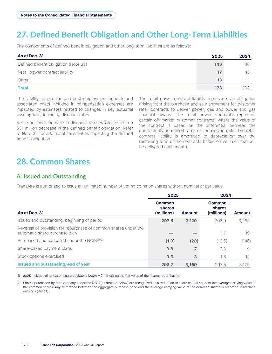 27. Defined Benefit Obligation and Other Long-Term Liabilities The components of defined benefit obligation and other long-term liabilities are as follows: As at Dec. 31 2025 2024 Defined benefit obligation (Note 32) 143 146 Retail power contract liability 17 45 Other 13 11 Total 173 202 The liability for pension and post-employment benefits and associated costs included in compensation expenses are impacted by estimates related to changes in key actuarial assumptions, including discount rates. A one per cent increase in discount rates would result in a $31 million decrease in the defined benefit obligation. Refer to Note 32 for additional sensitivities impacting the defined benefit obligation. The retail power contract liability represents an obligation arising from the purchase and sale agreement for customer retail contracts to deliver power, gas and power and gas financial swaps. The retail power contracts represent certain off-market customer contracts, where the value of the contract is based on the differential between the contractual and market rates on the closing date. The retail contract liability is amortized to depreciation over the remaining term of the contracts based on volumes that will be delivered each month. 28. Common Shares A. Issued and Outstanding TransAlta is authorized to issue an unlimited number of voting common shares without nominal or par value. As at Dec. 31 2025 2024 Common shares (millions) Amount Common shares (millions) Amount Issued and outstanding, beginning of period 297.5 3,179 306.9 3,285 Reversal of provision for repurchase of common shares under the automatic share purchase plan — — 1.7 19 Purchased and cancelled under the NCIB(1)(2) (1.9) (20) (13.5) (146) Share-based payment plans 0.8 7 0.8 9 Stock options exercised 0.3 3 1.6 12 Issued and outstanding, end of year 296.7 3,169 297.5 3,179 (1) 2025 includes nil of tax on share buybacks (2024 – 2 million) on the fair value of the shares repurchased. (2) Shares purchased by the Company under the NCIB (as defined below) are recognized as a reduction to share capital equal to the average carrying value of the common shares. Any difference between the aggregate purchase price and the average carrying value of the common shares is recorded in retained earnings (deficit). F73 TransAlta Corporation 2025 Annual Report