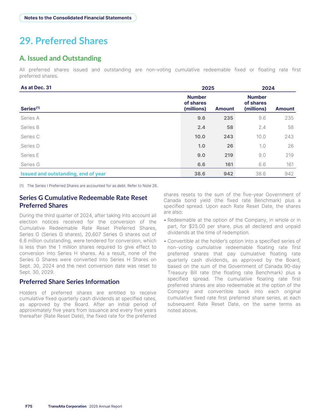 29. Preferred Shares A. Issued and Outstanding All preferred shares issued and outstanding are non-voting cumulative redeemable fixed or floating rate first preferred shares. As at Dec. 31 2025 2024 Series(1) Number of shares (millions) Amount Number of shares (millions) Amount Series A 9.6 235 9.6 235 Series B 2.4 58 2.4 58 Series C 10.0 243 10.0 243 Series D 1.0 26 1.0 26 Series E 9.0 219 9.0 219 Series G 6.6 161 6.6 161 Issued and outstanding, end of year 38.6 942 38.6 942 (1) The Series I Preferred Shares are accounted for as debt. Refer to Note 26. Series G Cumulative Redeemable Rate Reset Preferred Shares During the third quarter of 2024, after taking into account all election notices received for the conversion of the Cumulative Redeemable Rate Reset Preferred Shares, Series G (Series G shares), 20,607 Series G shares out of 6.6 million outstanding, were tendered for conversion, which is less than the 1  million shares required to give effect to conversion into Series H shares. As a result, none of the Series G Shares were converted into Series H Shares on Sept. 30, 2024 and the next conversion date was reset to Sept. 30, 2029. Preferred Share Series Information Holders of preferred shares are entitled to receive cumulative fixed quarterly cash dividends at specified rates, as approved by the Board. After an initial period of approximately five years from issuance and every five years thereafter (Rate Reset Date), the fixed rate for the preferred shares resets to the sum of the five-year Government of Canada bond yield (the fixed rate Benchmark) plus a specified spread. Upon each Rate Reset Date, the shares are also: • Redeemable at the option of the Company, in whole or in part, for $25.00 per share, plus all declared and unpaid dividends at the time of redemption. • Convertible at the holder’s option into a specified series of non-voting cumulative redeemable floating rate first preferred shares that pay cumulative floating rate quarterly cash dividends, as approved by the Board, based on the sum of the Government of Canada 90-day Treasury Bill rate (the floating rate Benchmark) plus a specified spread. The cumulative floating rate first preferred shares are also redeemable at the option of the Company and convertible back into each original cumulative fixed rate first preferred share series, at each subsequent Rate Reset Date, on the same terms as noted above. F75 TransAlta Corporation 2025 Annual Report