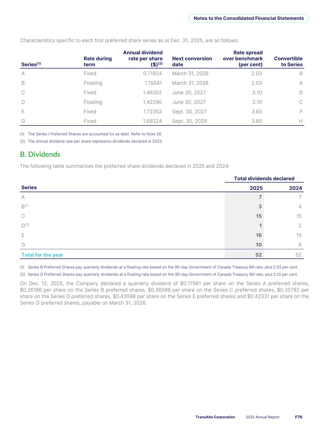 Characteristics specific to each first preferred share series as at Dec. 31, 2025, are as follows: Series(1) Rate during term Annual dividend rate per share ($)(2) Next conversion date Rate spread over benchmark (per cent) Convertible to Series A Fixed 0.71924 March 31, 2026 2.03 B B Floating 1.15541 March 31, 2026 2.03 A C Fixed 1.46352 June 30, 2027 3.10 D D Floating 1.42290 June 30, 2027 3.10 C E Fixed 1.72352 Sept. 30, 2027 3.65 F G Fixed 1.69324 Sept. 30, 2029 3.80 H (1) The Series I Preferred Shares are accounted for as debt. Refer to Note 26. (2) The annual dividend rate per share represents dividends declared in 2025. B. Dividends The following table summarizes the preferred share dividends declared in 2025 and 2024: Total dividends declared Series 2025 2024 A 7 7 B(1) 3 4 C 15 15 D(2) 1 2 E 16 15 G 10 9 Total for the year 52 52 (1) Series B Preferred Shares pay quarterly dividends at a floating rate based on the 90-day Government of Canada Treasury Bill rate, plus 2.03 per cent. (2) Series D Preferred Shares pay quarterly dividends at a floating rate based on the 90-day Government of Canada Treasury Bill rate, plus 3.10 per cent. On Dec. 12, 2025, the Company declared a quarterly dividend of $0.17981 per share on the Series A preferred shares, $0.26186 per share on the Series B preferred shares, $0.36588 per share on the Series C preferred shares, $0.32782 per share on the Series D preferred shares, $0.43088 per share on the Series E preferred shares and $0.42331 per share on the Series G preferred shares, payable on March 31, 2026. TransAlta Corporation 2025 Annual Report F76