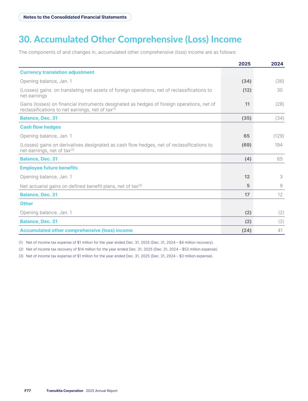 30. Accumulated Other Comprehensive (Loss) Income The components of and changes in, accumulated other comprehensive (loss) income are as follows:   2025 2024 Currency translation adjustment     Opening balance, Jan. 1 (34) (36) (Losses) gains on translating net assets of foreign operations, net of reclassifications to net earnings (12) 30 Gains (losses) on financial instruments designated as hedges of foreign operations, net of reclassifications to net earnings, net of tax(1) 11 (28) Balance, Dec. 31 (35) (34) Cash flow hedges     Opening balance, Jan. 1 65 (129) (Losses) gains on derivatives designated as cash flow hedges, net of reclassifications to net earnings, net of tax(2) (69) 194 Balance, Dec. 31 (4) 65 Employee future benefits     Opening balance, Jan. 1 12 3 Net actuarial gains on defined benefit plans, net of tax(3) 5 9 Balance, Dec. 31 17 12 Other     Opening balance, Jan. 1 (2) (2) Balance, Dec. 31 (2) (2) Accumulated other comprehensive (loss) income (24) 41 (1) Net of income tax expense of $1 million for the year ended Dec. 31, 2025 (Dec. 31, 2024 – $4 million recovery). (2) Net of income tax recovery of $14 million for the year ended Dec. 31, 2025 (Dec. 31, 2024 – $53 million expense). (3) Net of income tax expense of $1 million for the year ended Dec. 31, 2025 (Dec. 31, 2024 – $3 million expense). F77 TransAlta Corporation 2025 Annual Report