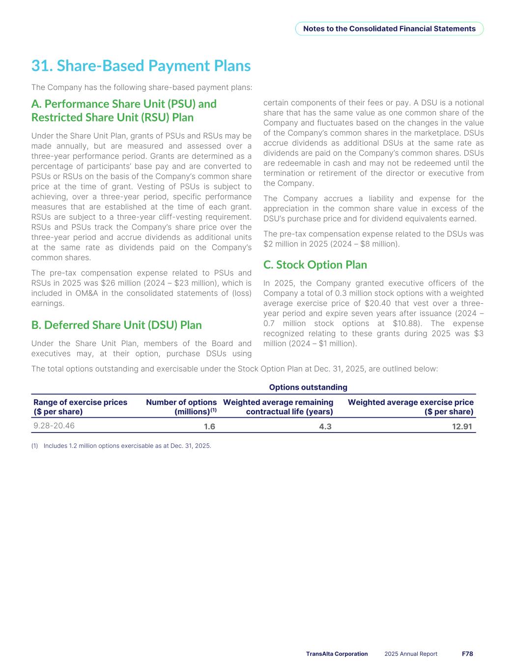 31. Share-Based Payment Plans The Company has the following share-based payment plans: A. Performance Share Unit (PSU) and Restricted Share Unit (RSU) Plan Under the Share Unit Plan, grants of PSUs and RSUs may be made annually, but are measured and assessed over a three-year performance period. Grants are determined as a percentage of participants’ base pay and are converted to PSUs or RSUs on the basis of the Company’s common share price at the time of grant. Vesting of PSUs is subject to achieving, over a three-year period, specific performance measures that are established at the time of each grant. RSUs are subject to a three-year cliff-vesting requirement. RSUs and PSUs track the Company’s share price over the three-year period and accrue dividends as additional units at the same rate as dividends paid on the Company’s common shares. The pre-tax compensation expense related to PSUs and RSUs in 2025 was $26 million (2024 – $23 million), which is included in OM&A in the consolidated statements of (loss) earnings. B. Deferred Share Unit (DSU) Plan Under the Share Unit Plan, members of the Board and executives may, at their option, purchase DSUs using certain components of their fees or pay. A DSU is a notional share that has the same value as one common share of the Company and fluctuates based on the changes in the value of the Company’s common shares in the marketplace. DSUs accrue dividends as additional DSUs at the same rate as dividends are paid on the Company’s common shares. DSUs are redeemable in cash and may not be redeemed until the termination or retirement of the director or executive from the Company. The Company accrues a liability and expense for the appreciation in the common share value in excess of the DSU’s purchase price and for dividend equivalents earned. The pre-tax compensation expense related to the DSUs was $2 million in 2025 (2024 – $8 million). C. Stock Option Plan In 2025, the Company granted executive officers of the Company a total of 0.3 million stock options with a weighted average exercise price of $20.40 that vest over a three- year period and expire seven years after issuance (2024 – 0.7  million stock options at $10.88). The expense recognized relating to these grants during 2025 was $3 million (2024 – $1 million). The total options outstanding and exercisable under the Stock Option Plan at Dec. 31, 2025, are outlined below:   Options outstanding Range of exercise prices ($ per share) Number of options (millions)(1) Weighted average remaining contractual life (years) Weighted average exercise price ($ per share) 9.28-20.46 1.6 4.3 12.91 (1) Includes 1.2 million options exercisable as at Dec. 31, 2025. TransAlta Corporation 2025 Annual Report F78
