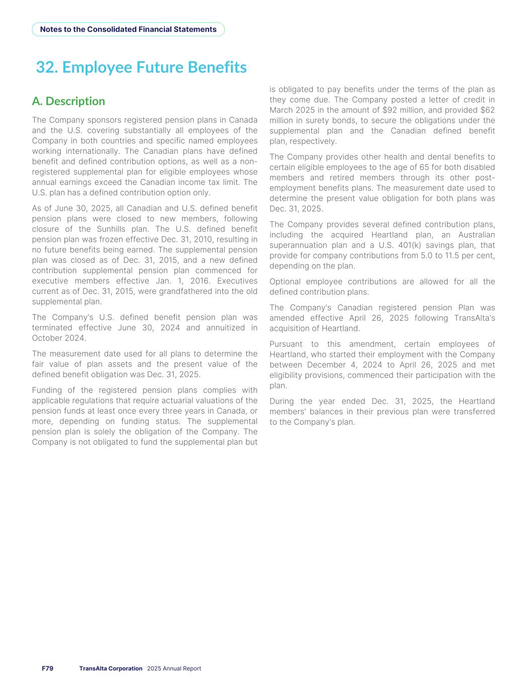32. Employee Future Benefits A. Description The Company sponsors registered pension plans in Canada and the U.S. covering substantially all employees of the Company in both countries and specific named employees working internationally. The Canadian plans have defined benefit and defined contribution options, as well as a non- registered supplemental plan for eligible employees whose annual earnings exceed the Canadian income tax limit. The U.S. plan has a defined contribution option only. As of June 30, 2025, all Canadian and U.S. defined benefit pension plans were closed to new members, following closure of the Sunhills plan. The U.S. defined benefit pension plan was frozen effective Dec. 31, 2010, resulting in no future benefits being earned. The supplemental pension plan was closed as of Dec. 31, 2015, and a new defined contribution supplemental pension plan commenced for executive members effective Jan. 1, 2016. Executives current as of Dec. 31, 2015, were grandfathered into the old supplemental plan. The Company's U.S. defined benefit pension plan was terminated effective June 30, 2024 and annuitized in October 2024. The measurement date used for all plans to determine the fair value of plan assets and the present value of the defined benefit obligation was Dec. 31, 2025. Funding of the registered pension plans complies with applicable regulations that require actuarial valuations of the pension funds at least once every three years in Canada, or more, depending on funding status. The supplemental pension plan is solely the obligation of the Company. The Company is not obligated to fund the supplemental plan but is obligated to pay benefits under the terms of the plan as they come due. The Company posted a letter of credit in March 2025 in the amount of $92 million, and provided $62 million in surety bonds, to secure the obligations under the supplemental plan and the Canadian defined benefit plan, respectively. The Company provides other health and dental benefits to certain eligible employees to the age of 65 for both disabled members and retired members through its other post- employment benefits plans. The measurement date used to determine the present value obligation for both plans was Dec. 31, 2025. The Company provides several defined contribution plans, including the acquired Heartland plan, an Australian superannuation plan and a U.S. 401(k)  savings plan, that provide for company contributions from 5.0 to 11.5 per cent, depending on the plan. Optional employee contributions are allowed for all the defined contribution plans. The Company's Canadian registered pension Plan was amended effective April 26, 2025 following TransAlta's acquisition of Heartland. Pursuant to this amendment, certain employees of Heartland, who started their employment with the Company between December 4, 2024 to April 26, 2025 and met eligibility provisions, commenced their participation with the plan. During the year ended Dec. 31, 2025, the Heartland members' balances in their previous plan were transferred to the Company's plan. F79 TransAlta Corporation 2025 Annual Report