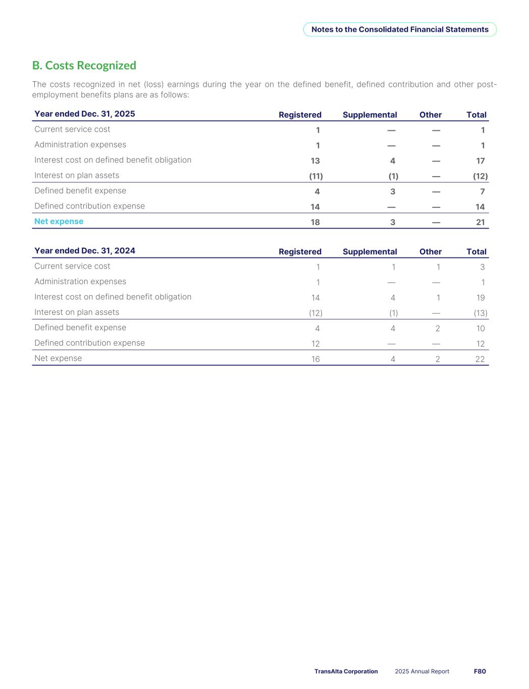 B. Costs Recognized The costs recognized in net (loss) earnings during the year on the defined benefit, defined contribution and other post- employment benefits plans are as follows: Year ended Dec. 31, 2025 Registered Supplemental Other Total Current service cost 1 — — 1 Administration expenses 1 — — 1 Interest cost on defined benefit obligation 13 4 — 17 Interest on plan assets (11) (1) — (12) Defined benefit expense 4 3 — 7 Defined contribution expense 14 — — 14 Net expense 18 3 — 21 Year ended Dec. 31, 2024 Registered Supplemental Other Total Current service cost 1 1 1 3 Administration expenses 1 — — 1 Interest cost on defined benefit obligation 14 4 1 19 Interest on plan assets (12) (1) — (13) Defined benefit expense 4 4 2 10 Defined contribution expense 12 — — 12 Net expense 16 4 2 22 TransAlta Corporation 2025 Annual Report F80