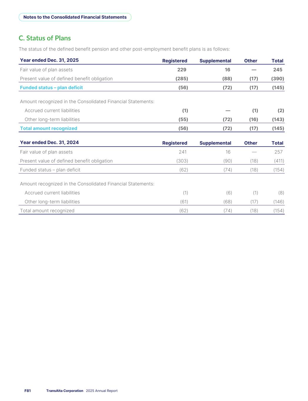 C. Status of Plans The status of the defined benefit pension and other post-employment benefit plans is as follows: Year ended Dec. 31, 2025 Registered Supplemental Other Total Fair value of plan assets 229 16 — 245 Present value of defined benefit obligation (285) (88) (17) (390) Funded status – plan deficit (56) (72) (17) (145) Amount recognized in the Consolidated Financial Statements:         Accrued current liabilities (1) — (1) (2) Other long-term liabilities (55) (72) (16) (143) Total amount recognized (56) (72) (17) (145) Year ended Dec. 31, 2024 Registered Supplemental Other Total Fair value of plan assets 241 16 — 257 Present value of defined benefit obligation (303) (90) (18) (411) Funded status – plan deficit (62) (74) (18) (154) Amount recognized in the Consolidated Financial Statements: Accrued current liabilities (1) (6) (1) (8) Other long-term liabilities (61) (68) (17) (146) Total amount recognized (62) (74) (18) (154) F81 TransAlta Corporation 2025 Annual Report