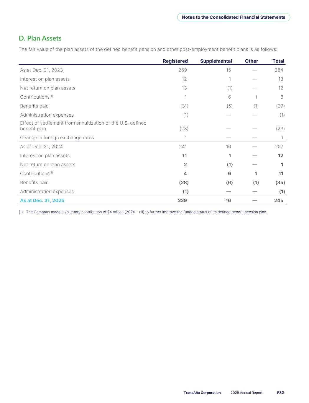 D. Plan Assets The fair value of the plan assets of the defined benefit pension and other post-employment benefit plans is as follows:   Registered Supplemental Other Total As at Dec. 31, 2023 269 15 — 284 Interest on plan assets 12 1 — 13 Net return on plan assets 13 (1) — 12 Contributions(1) 1 6 1 8 Benefits paid (31) (5) (1) (37) Administration expenses (1) — — (1) Effect of settlement from annuitization of the U.S. defined benefit plan (23) — — (23) Change in foreign exchange rates 1 — — 1 As at Dec. 31, 2024 241 16 — 257 Interest on plan assets 11 1 — 12 Net return on plan assets 2 (1) — 1 Contributions(1) 4 6 1 11 Benefits paid (28) (6) (1) (35) Administration expenses (1) — — (1) As at Dec. 31, 2025 229 16 — 245 (1) The Company made a voluntary contribution of $4 million (2024 – nil) to further improve the funded status of its defined benefit pension plan. TransAlta Corporation 2025 Annual Report F82