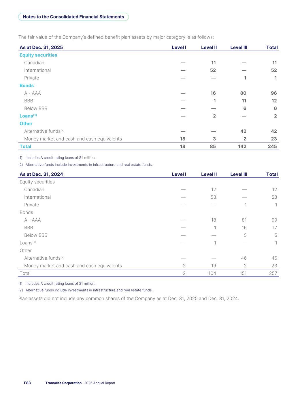 The fair value of the Company’s defined benefit plan assets by major category is as follows: As at Dec. 31, 2025 Level I Level II Level III Total Equity securities         Canadian — 11 — 11 International — 52 — 52 Private — — 1 1 Bonds         A - AAA — 16 80 96 BBB — 1 11 12 Below BBB — — 6 6 Loans(1) — 2 — 2 Other Alternative funds(2) — — 42 42 Money market and cash and cash equivalents 18 3 2 23 Total 18 85 142 245 (1) Includes A credit rating loans of $1 million. (2) Alternative funds include investments in infrastructure and real estate funds. As at Dec. 31, 2024 Level I Level II Level III Total Equity securities         Canadian — 12 — 12 International — 53 — 53 Private — — 1 1 Bonds A - AAA — 18 81 99 BBB — 1 16 17 Below BBB — — 5 5 Loans(1) — 1 — 1 Other Alternative funds(2) — — 46 46 Money market and cash and cash equivalents 2 19 2 23 Total 2 104 151 257 (1) Includes A credit rating loans of $1 million. (2) Alternative funds include investments in infrastructure and real estate funds. Plan assets did not include any common shares of the Company as at Dec. 31, 2025 and Dec. 31, 2024. F83 TransAlta Corporation 2025 Annual Report