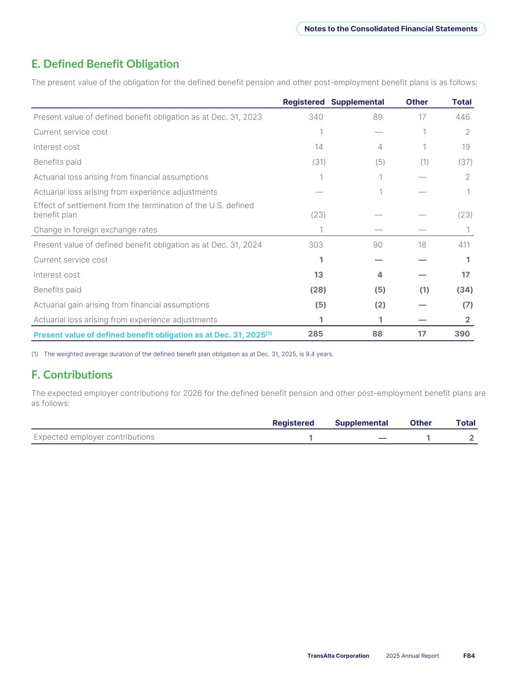 E. Defined Benefit Obligation The present value of the obligation for the defined benefit pension and other post-employment benefit plans is as follows:   Registered Supplemental Other Total Present value of defined benefit obligation as at Dec. 31, 2023 340 89 17 446 Current service cost 1 — 1 2 Interest cost 14 4 1 19 Benefits paid (31) (5) (1) (37) Actuarial loss arising from financial assumptions 1 1 — 2 Actuarial loss arising from experience adjustments — 1 — 1 Effect of settlement from the termination of the U.S. defined benefit plan (23) — — (23) Change in foreign exchange rates 1 — — 1 Present value of defined benefit obligation as at Dec. 31, 2024 303 90 18 411 Current service cost 1 — — 1 Interest cost 13 4 — 17 Benefits paid (28) (5) (1) (34) Actuarial gain arising from financial assumptions (5) (2) — (7) Actuarial loss arising from experience adjustments 1 1 — 2 Present value of defined benefit obligation as at Dec. 31, 2025(1) 285 88 17 390 (1) The weighted average duration of the defined benefit plan obligation as at Dec. 31, 2025, is 9.4 years. F. Contributions The expected employer contributions for 2026 for the defined benefit pension and other post-employment benefit plans are as follows:   Registered Supplemental Other Total Expected employer contributions 1 — 1 2 TransAlta Corporation 2025 Annual Report F84