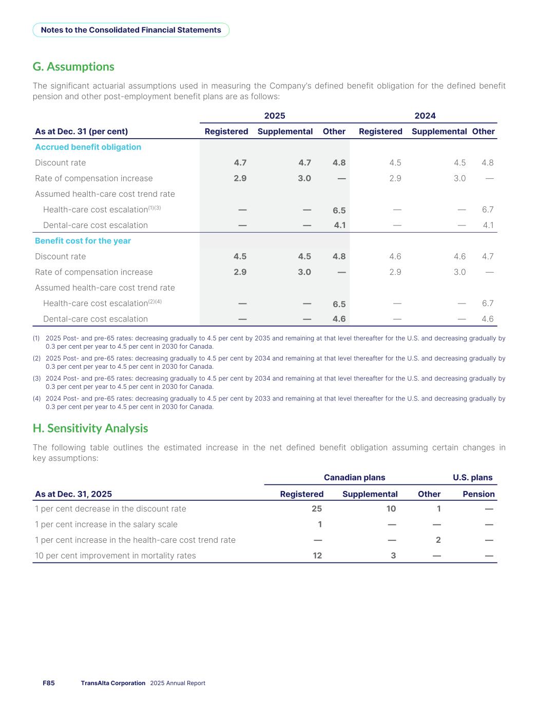 G. Assumptions The significant actuarial assumptions used in measuring the Company’s defined benefit obligation for the defined benefit pension and other post-employment benefit plans are as follows:   2025 2024 As at Dec. 31 (per cent) Registered Supplemental Other  Registered Supplemental Other Accrued benefit obligation             Discount rate 4.7 4.7 4.8 4.5 4.5 4.8 Rate of compensation increase 2.9 3.0 — 2.9 3.0 — Assumed health-care cost trend rate       Health-care cost escalation(1)(3) — — 6.5 — — 6.7 Dental-care cost escalation — — 4.1 — — 4.1 Benefit cost for the year       Discount rate 4.5 4.5 4.8 4.6 4.6 4.7 Rate of compensation increase 2.9 3.0 — 2.9 3.0 — Assumed health-care cost trend rate       Health-care cost escalation(2)(4) — — 6.5 — — 6.7 Dental-care cost escalation — — 4.6 — — 4.6 (1) 2025 Post- and pre-65 rates: decreasing gradually to 4.5 per cent by 2035 and remaining at that level thereafter for the U.S. and decreasing gradually by 0.3 per cent per year to 4.5 per cent in 2030 for Canada. (2) 2025 Post- and pre-65 rates: decreasing gradually to 4.5 per cent by 2034 and remaining at that level thereafter for the U.S. and decreasing gradually by 0.3 per cent per year to 4.5 per cent in 2030 for Canada. (3) 2024 Post- and pre-65 rates: decreasing gradually to 4.5 per cent by 2034 and remaining at that level thereafter for the U.S. and decreasing gradually by 0.3 per cent per year to 4.5 per cent in 2030 for Canada. (4) 2024 Post- and pre-65 rates: decreasing gradually to 4.5 per cent by 2033 and remaining at that level thereafter for the U.S. and decreasing gradually by 0.3 per cent per year to 4.5 per cent in 2030 for Canada. H. Sensitivity Analysis The following table outlines the estimated increase in the net defined benefit obligation assuming certain changes in key assumptions:   Canadian plans U.S. plans As at Dec. 31, 2025 Registered Supplemental Other  Pension 1 per cent decrease in the discount rate 25 10 1 — 1 per cent increase in the salary scale 1 — — — 1 per cent increase in the health-care cost trend rate — — 2 — 10 per cent improvement in mortality rates 12 3 — — F85 TransAlta Corporation 2025 Annual Report