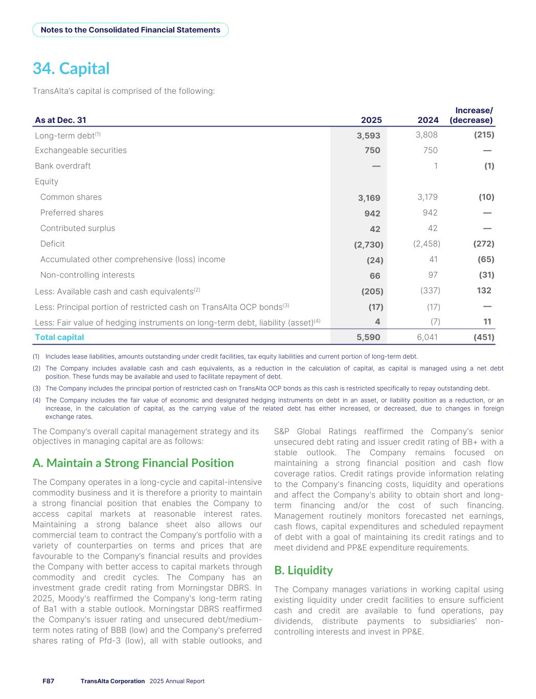 34. Capital TransAlta’s capital is comprised of the following: As at Dec. 31 2025 2024 Increase/ (decrease) Long-term debt(1) 3,593 3,808 (215) Exchangeable securities 750 750 — Bank overdraft — 1 (1) Equity       Common shares 3,169 3,179 (10) Preferred shares 942 942 — Contributed surplus 42 42 — Deficit (2,730) (2,458) (272) Accumulated other comprehensive (loss) income (24) 41 (65) Non-controlling interests 66 97 (31) Less: Available cash and cash equivalents(2) (205) (337) 132 Less: Principal portion of restricted cash on TransAlta OCP bonds(3) (17) (17) — Less: Fair value of hedging instruments on long-term debt, liability (asset)(4) 4 (7) 11 Total capital 5,590 6,041 (451) (1) Includes lease liabilities, amounts outstanding under credit facilities, tax equity liabilities and current portion of long-term debt. (2) The Company includes available cash and cash equivalents, as a reduction in the calculation of capital, as capital is managed using a net debt position. These funds may be available and used to facilitate repayment of debt. (3) The Company includes the principal portion of restricted cash on TransAlta OCP bonds as this cash is restricted specifically to repay outstanding debt. (4) The Company includes the fair value of economic and designated hedging instruments on debt in an asset, or liability position as a reduction, or an increase, in the calculation of capital, as the carrying value of the related debt has either increased, or decreased, due to changes in foreign exchange rates. The Company’s overall capital management strategy and its objectives in managing capital are as follows: A. Maintain a Strong Financial Position The Company operates in a long-cycle and capital-intensive commodity business and it is therefore a priority to maintain a strong financial position that enables the Company to access capital markets at reasonable interest rates. Maintaining a strong balance sheet also allows our commercial team to contract the Company’s portfolio with a variety of counterparties on terms and prices that are favourable to the Company’s financial results and provides the Company with better access to capital markets through commodity and credit cycles. The Company has an investment grade credit rating from Morningstar DBRS. In 2025, Moody's reaffirmed the Company's long-term rating of Ba1 with a stable outlook. Morningstar DBRS reaffirmed the Company's issuer rating and unsecured debt/medium- term notes rating of BBB (low) and the Company's preferred shares rating of Pfd-3 (low), all with stable outlooks, and S&P Global Ratings reaffirmed the Company's senior unsecured debt rating and issuer credit rating of BB+ with a stable outlook. The Company remains focused on maintaining a strong financial position and cash flow coverage ratios. Credit ratings provide information relating to the Company's financing costs, liquidity and operations and affect the Company's ability to obtain short and long- term financing and/or the cost of such  financing. Management routinely monitors forecasted net earnings, cash flows, capital expenditures and scheduled repayment of debt with a goal of maintaining its credit ratings and to meet dividend and PP&E expenditure requirements. B. Liquidity The Company manages variations in working capital using existing liquidity under credit facilities to ensure sufficient cash and credit are available to fund operations, pay dividends, distribute payments to subsidiaries' non- controlling interests and invest in PP&E. F87 TransAlta Corporation 2025 Annual Report