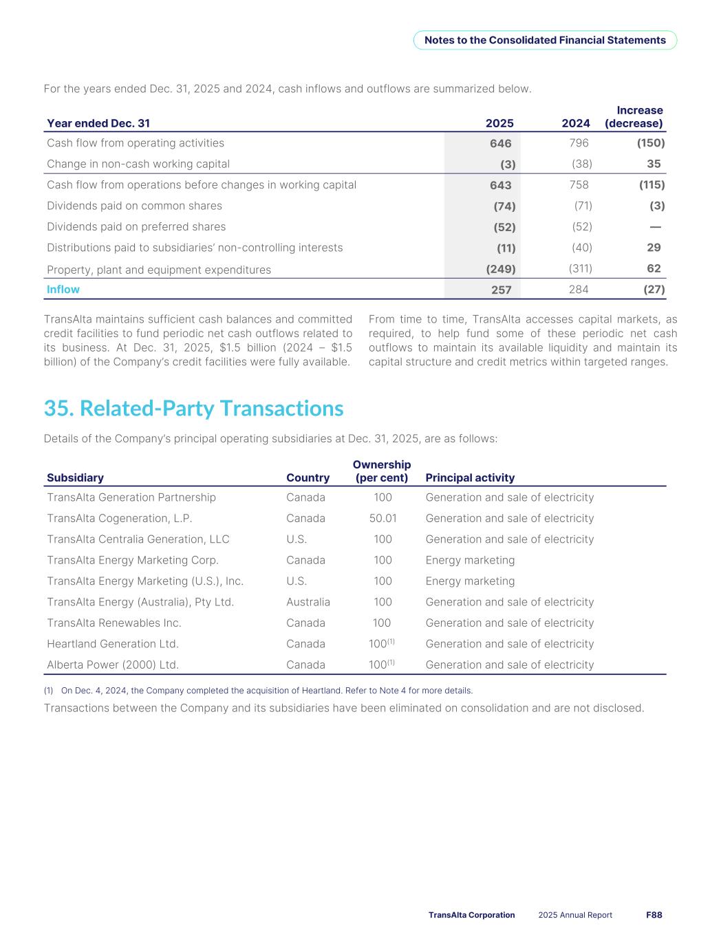 For the years ended Dec. 31, 2025 and 2024, cash inflows and outflows are summarized below. Year ended Dec. 31 2025 2024 Increase (decrease) Cash flow from operating activities 646 796 (150) Change in non-cash working capital (3) (38) 35 Cash flow from operations before changes in working capital 643 758 (115) Dividends paid on common shares (74) (71) (3) Dividends paid on preferred shares (52) (52) — Distributions paid to subsidiaries’ non-controlling interests (11) (40) 29 Property, plant and equipment expenditures (249) (311) 62 Inflow 257 284 (27) TransAlta maintains sufficient cash balances and committed credit facilities to fund periodic net cash outflows related to its business. At Dec. 31, 2025, $1.5 billion (2024 – $1.5 billion) of the Company’s credit facilities were fully available. From time to time, TransAlta accesses capital markets, as required, to help fund some of these periodic net cash outflows to maintain its available liquidity and maintain its capital structure and credit metrics within targeted ranges. 35. Related-Party Transactions Details of the Company’s principal operating subsidiaries at Dec. 31, 2025, are as follows: Subsidiary Country Ownership (per cent) Principal activity TransAlta Generation Partnership Canada 100 Generation and sale of electricity TransAlta Cogeneration, L.P. Canada 50.01 Generation and sale of electricity TransAlta Centralia Generation, LLC U.S. 100 Generation and sale of electricity TransAlta Energy Marketing Corp. Canada 100 Energy marketing TransAlta Energy Marketing (U.S.), Inc. U.S. 100 Energy marketing TransAlta Energy (Australia), Pty Ltd. Australia 100 Generation and sale of electricity TransAlta Renewables Inc. Canada 100 Generation and sale of electricity Heartland Generation Ltd. Canada 100(1) Generation and sale of electricity Alberta Power (2000) Ltd. Canada 100(1) Generation and sale of electricity (1) On Dec. 4, 2024, the Company completed the acquisition of Heartland. Refer to Note 4 for more details. Transactions between the Company and its subsidiaries have been eliminated on consolidation and are not disclosed. TransAlta Corporation 2025 Annual Report F88