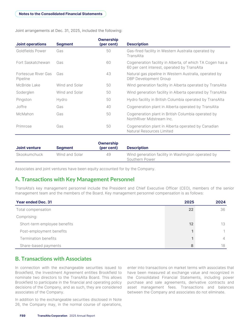 Joint arrangements at Dec. 31, 2025, included the following: Joint operations Segment Ownership (per cent) Description Goldfields Power Gas 50 Gas-fired facility in Western Australia operated by TransAlta Fort Saskatchewan Gas 60 Cogeneration facility in Alberta, of which TA Cogen has a 60 per cent interest, operated by TransAlta Fortescue River Gas Pipeline Gas 43 Natural gas pipeline in Western Australia, operated by DBP Development Group McBride Lake Wind and Solar 50 Wind generation facility in Alberta operated by TransAlta Soderglen Wind and Solar 50 Wind generation facility in Alberta operated by TransAlta Pingston Hydro 50 Hydro facility in British Columbia operated by TransAlta Joffre Gas 40 Cogeneration plant in Alberta operated by TransAlta McMahon Gas 50 Cogeneration plant in British Columbia operated by NorthRiver Midstream Inc. Primrose Gas 50 Cogeneration plant in Alberta operated by Canadian Natural Resources Limited Joint venture Segment Ownership (per cent) Description Skookumchuck Wind and Solar 49 Wind generation facility in Washington operated by Southern Power Associates and joint ventures have been equity accounted for by the Company. A. Transactions with Key Management Personnel TransAlta’s key management personnel include the President and Chief Executive Officer (CEO), members of the senior management team and the members of the Board. Key management personnel compensation is as follows: Year ended Dec. 31 2025 2024 Total compensation 22 36 Comprising:     Short-term employee benefits 12 13 Post-employment benefits 1 1 Termination benefits 1 4 Share-based payments 8 18 B. Transactions with Associates In connection with the exchangeable securities issued to Brookfield, the Investment Agreement entitles Brookfield to nominate two directors to the TransAlta Board. This allows Brookfield to participate in the financial and operating policy decisions of the Company, and as such, they are considered associates of the Company. In addition to the exchangeable securities disclosed in Note 26, the Company may, in the normal course of operations, enter into transactions on market terms with associates that have been measured at exchange value and recognized in the Consolidated Financial Statements, including power purchase and sale agreements, derivative contracts and asset management fees. Transactions and balances between the Company and associates do not eliminate. F89 TransAlta Corporation 2025 Annual Report