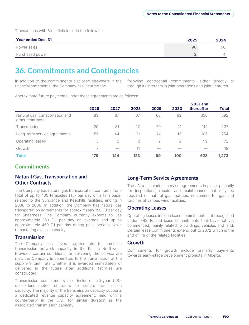 Transactions with Brookfield include the following: Year ended Dec. 31 2025 2024 Power sales 98 58 Purchased power 2 4 36. Commitments and Contingencies In addition to the commitments disclosed elsewhere in the financial statements, the Company has incurred the following contractual commitments, either directly or through its interests in joint operations and joint ventures. Approximate future payments under these agreements are as follows: 2026 2027 2028 2029 2030 2031 and thereafter Total Natural gas, transportation and other contracts 83 67 67 63 62 350 692 Transmission 29 31 22 20 21 114 237 Long-term service agreements 55 44 21 14 15 105 254 Operating leases 5 2 2 2 2 59 72 Growth 7 — 11 — — — 18 Total 179 144 123 99 100 628 1,273 Commitments Natural Gas, Transportation and Other Contracts The Company has natural gas transportation contracts, for a total of up to 400 terajoules (TJ) per day on a firm basis, related to the Sundance and Keephills facilities, ending in 2036 to 2038. In addition, the Company has natural gas transportation agreements for approximately 150 TJ per day for Sheerness. The Company currently expects to use approximately 160 TJ per day on average and up to approximately 450 TJ per day during peak periods, while remarketing excess capacity. Transmission The Company has several agreements to purchase transmission network capacity in the Pacific Northwest. Provided certain conditions for delivering the service are met, the Company is committed to the transmission at the supplier’s tariff rate whether it is awarded immediately or delivered in the future after additional facilities are constructed. Transmission commitments also include multi-year U.S.- dollar-denominated contracts to secure transmission capacity. The majority of the transmission capacity supports a dedicated revenue capacity agreement, held with a counterparty in the U.S., for similar duration as the associated transmission capacity. Long-Term Service Agreements TransAlta has various service agreements in place, primarily for inspections, repairs and maintenance that may be required on natural gas facilities, equipment for gas and turbines at various wind facilities. Operating Leases Operating leases include lease commitments not recognized under IFRS 16 and lease commitments that have not yet commenced, mainly related to buildings, vehicles and land. Certain lease commitments extend out to 2072 which is the end of life of the related facilities. Growth Commitments for growth include primarily payments towards early-stage development projects in Alberta. TransAlta Corporation 2025 Annual Report F90