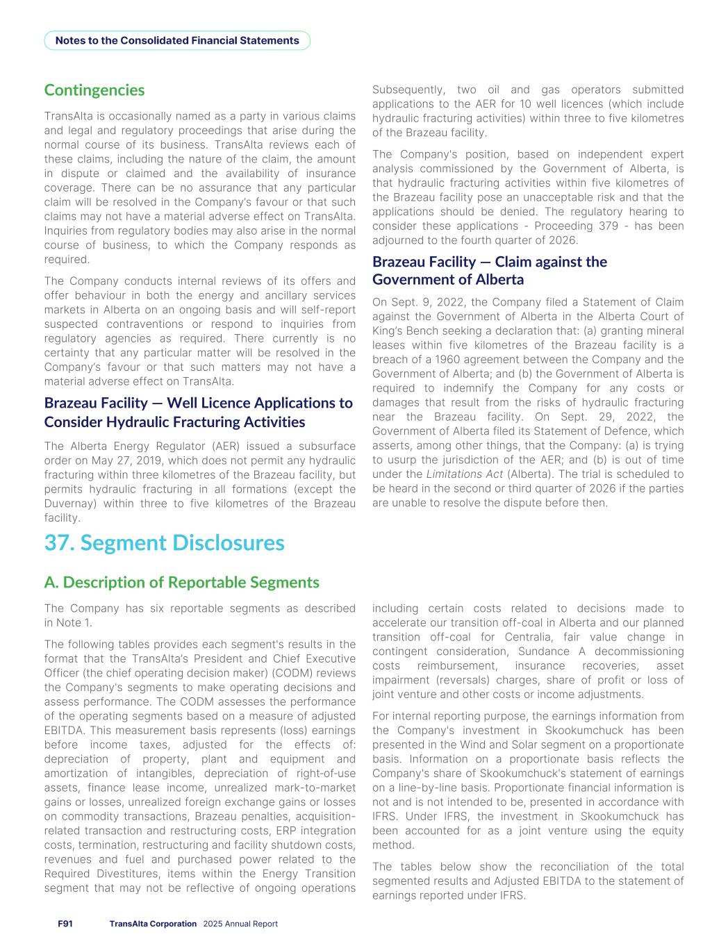 Contingencies TransAlta is occasionally named as a party in various claims and legal and regulatory proceedings that arise during the normal course of its business. TransAlta reviews each of these claims, including the nature of the claim, the amount in dispute or claimed and the availability of insurance coverage. There can be no assurance that any particular claim will be resolved in the Company’s favour or that such claims may not have a material adverse effect on TransAlta. Inquiries from regulatory bodies may also arise in the normal course of business, to which the Company responds as required. The Company conducts internal reviews of its offers and offer behaviour in both the energy and ancillary services markets in Alberta on an ongoing basis and will self-report suspected contraventions or respond to inquiries from regulatory agencies as required. There currently is no certainty that any particular matter will be resolved in the Company’s favour or that such matters may not have a material adverse effect on TransAlta. Brazeau Facility — Well Licence Applications to Consider Hydraulic Fracturing Activities The Alberta Energy Regulator (AER) issued a subsurface order on May 27, 2019, which does not permit any hydraulic fracturing within three kilometres of the Brazeau facility, but permits hydraulic fracturing in all formations (except the Duvernay) within three to five kilometres of the Brazeau facility. Subsequently, two oil and gas operators submitted applications to the AER for 10 well licences (which include hydraulic fracturing activities) within three to five kilometres of the Brazeau facility. The Company's position, based on independent expert analysis commissioned by the Government of Alberta, is that hydraulic fracturing activities within five kilometres of the Brazeau facility pose an unacceptable risk and that the applications should be denied. The regulatory hearing to consider these applications - Proceeding 379 - has been adjourned to the fourth quarter of 2026. Brazeau Facility — Claim against the Government of Alberta On Sept. 9, 2022, the Company filed a Statement of Claim against the Government of Alberta in the Alberta Court of King’s Bench seeking a declaration that: (a) granting mineral leases within five kilometres of the Brazeau facility is a breach of a 1960 agreement between the Company and the Government of Alberta; and (b) the Government of Alberta is required to indemnify the Company for any costs or damages that result from the risks of hydraulic fracturing near the Brazeau facility. On Sept. 29, 2022, the Government of Alberta filed its Statement of Defence, which asserts, among other things, that the Company: (a) is trying to usurp the jurisdiction of the AER; and (b) is out of time under the Limitations Act (Alberta). The trial is scheduled to be heard in the second or third quarter of 2026 if the parties are unable to resolve the dispute before then. 37. Segment Disclosures A. Description of Reportable Segments The Company has six reportable segments as described in Note 1. The following tables provides each segment's results in the format that the TransAlta’s President and Chief Executive Officer (the chief operating decision maker) (CODM) reviews the Company's segments to make operating decisions and assess performance. The CODM assesses the performance of the operating segments based on a measure of adjusted EBITDA. This measurement basis represents (loss) earnings before income taxes, adjusted for the effects of: depreciation of property, plant and equipment and amortization of intangibles, depreciation of right‐of‐use assets, finance lease income, unrealized mark-to-market gains or losses, unrealized foreign exchange gains or losses on commodity transactions, Brazeau penalties, acquisition- related transaction and restructuring costs, ERP integration costs, termination, restructuring and facility shutdown costs, revenues and fuel and purchased power related to the Required Divestitures, items within the Energy Transition segment that may not be reflective of ongoing operations including certain costs related to decisions made to accelerate our transition off-coal in Alberta and our planned transition off-coal for Centralia, fair value change in contingent consideration, Sundance A decommissioning costs reimbursement, insurance recoveries, asset impairment (reversals) charges, share of profit or loss of joint venture and other costs or income adjustments. For internal reporting purpose, the earnings information from the Company's investment in Skookumchuck has been presented in the Wind and Solar segment on a proportionate basis. Information on a proportionate basis reflects the Company's share of Skookumchuck's statement of earnings on a line-by-line basis. Proportionate financial information is not and is not intended to be, presented in accordance with IFRS. Under IFRS, the investment in Skookumchuck has been accounted for as a joint venture using the equity method. The tables below show the reconciliation of the total segmented results and Adjusted EBITDA to the statement of earnings reported under IFRS. F91 TransAlta Corporation 2025 Annual Report
