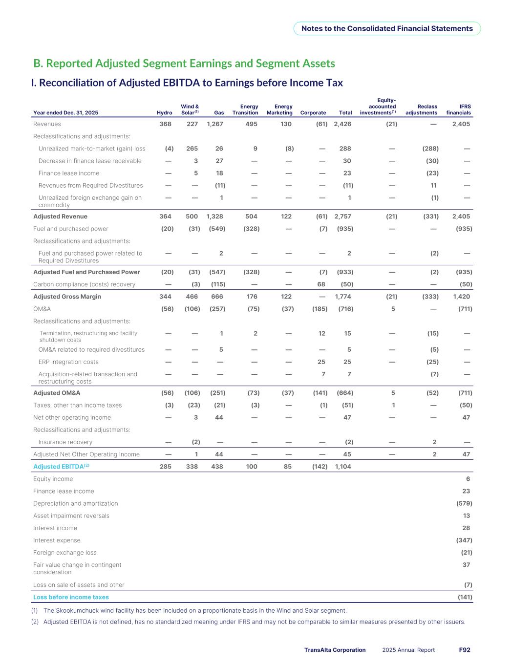 B. Reported Adjusted Segment Earnings and Segment Assets I. Reconciliation of Adjusted EBITDA to Earnings before Income Tax Year ended Dec. 31, 2025 Hydro Wind & Solar(1) Gas Energy Transition Energy Marketing Corporate Total Equity- accounted investments(1) Reclass adjustments IFRS financials Revenues 368 227 1,267 495 130 (61) 2,426 (21) — 2,405 Reclassifications and adjustments: Unrealized mark-to-market (gain) loss (4) 265 26 9 (8) — 288 — (288) — Decrease in finance lease receivable — 3 27 — — — 30 — (30) — Finance lease income — 5 18 — — — 23 — (23) — Revenues from Required Divestitures — — (11) — — — (11) — 11 — Unrealized foreign exchange gain on commodity — — 1 — — — 1 — (1) — Adjusted Revenue 364 500 1,328 504 122 (61) 2,757 (21) (331) 2,405 Fuel and purchased power (20) (31) (549) (328) — (7) (935) — — (935) Reclassifications and adjustments: Fuel and purchased power related to Required Divestitures — — 2 — — — 2 — (2) — Adjusted Fuel and Purchased Power (20) (31) (547) (328) — (7) (933) — (2) (935) Carbon compliance (costs) recovery — (3) (115) — — 68 (50) — — (50) Adjusted Gross Margin 344 466 666 176 122 — 1,774 (21) (333) 1,420 OM&A (56) (106) (257) (75) (37) (185) (716) 5 — (711) Reclassifications and adjustments: Termination, restructuring and facility shutdown costs — — 1 2 — 12 15 — (15) — OM&A related to required divestitures — — 5 — — — 5 — (5) — ERP integration costs — — — — — 25 25 — (25) — Acquisition-related transaction and restructuring costs — — — — — 7 7 (7) — Adjusted OM&A (56) (106) (251) (73) (37) (141) (664) 5 (52) (711) Taxes, other than income taxes (3) (23) (21) (3) — (1) (51) 1 — (50) Net other operating income — 3 44 — — — 47 — — 47 Reclassifications and adjustments: Insurance recovery — (2) — — — — (2) — 2 — Adjusted Net Other Operating Income — 1 44 — — — 45 — 2 47 Adjusted EBITDA(2) 285 338 438 100 85 (142) 1,104 Equity income 6 Finance lease income 23 Depreciation and amortization (579) Asset impairment reversals 13 Interest income 28 Interest expense (347) Foreign exchange loss (21) Fair value change in contingent consideration 37 Loss on sale of assets and other (7) Loss before income taxes (141) (1) The Skookumchuck wind facility has been included on a proportionate basis in the Wind and Solar segment. (2) Adjusted EBITDA is not defined, has no standardized meaning under IFRS and may not be comparable to similar measures presented by other issuers. TransAlta Corporation 2025 Annual Report F92