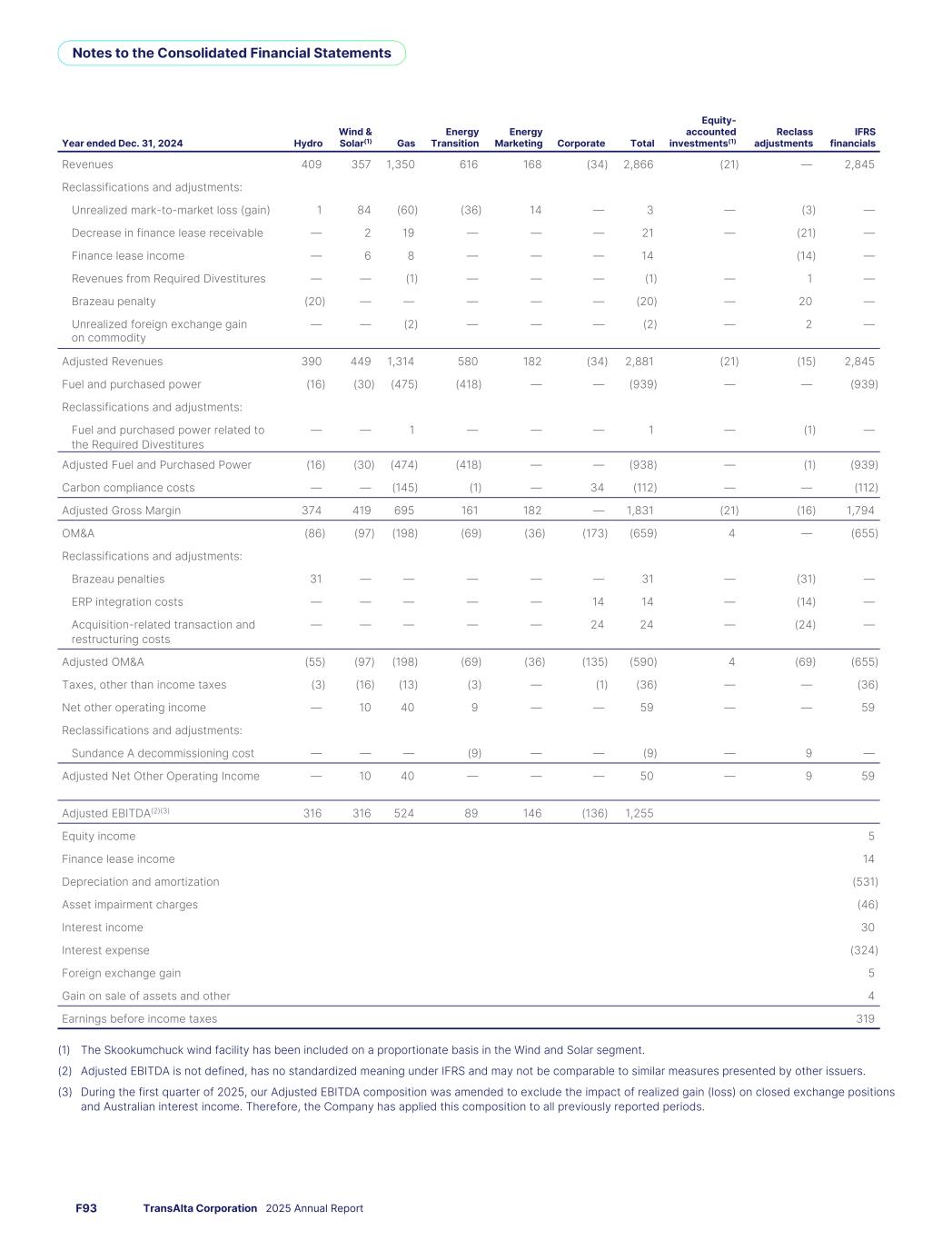 Year ended Dec. 31, 2024 Hydro Wind & Solar(1) Gas Energy Transition Energy Marketing Corporate Total Equity- accounted investments(1) Reclass adjustments IFRS financials Revenues 409 357 1,350 616 168 (34) 2,866 (21) — 2,845 Reclassifications and adjustments: Unrealized mark-to-market loss (gain) 1 84 (60) (36) 14 — 3 — (3) — Decrease in finance lease receivable — 2 19 — — — 21 — (21) — Finance lease income — 6 8 — — — 14 (14) — Revenues from Required Divestitures — — (1) — — — (1) — 1 — Brazeau penalty (20) — — — — — (20) — 20 — Unrealized foreign exchange gain on commodity — — (2) — — — (2) — 2 — Adjusted Revenues 390 449 1,314 580 182 (34) 2,881 (21) (15) 2,845 Fuel and purchased power (16) (30) (475) (418) — — (939) — — (939) Reclassifications and adjustments: Fuel and purchased power related to the Required Divestitures — — 1 — — — 1 — (1) — Adjusted Fuel and Purchased Power (16) (30) (474) (418) — — (938) — (1) (939) Carbon compliance costs — — (145) (1) — 34 (112) — — (112) Adjusted Gross Margin 374 419 695 161 182 — 1,831 (21) (16) 1,794 OM&A (86) (97) (198) (69) (36) (173) (659) 4 — (655) Reclassifications and adjustments: Brazeau penalties 31 — — — — — 31 — (31) — ERP integration costs — — — — — 14 14 — (14) — Acquisition-related transaction and restructuring costs — — — — — 24 24 — (24) — Adjusted OM&A (55) (97) (198) (69) (36) (135) (590) 4 (69) (655) Taxes, other than income taxes (3) (16) (13) (3) — (1) (36) — — (36) Net other operating income — 10 40 9 — — 59 — — 59 Reclassifications and adjustments: Sundance A decommissioning cost — — — (9) — — (9) — 9 — Adjusted Net Other Operating Income — 10 40 — — — 50 — 9 59 Adjusted EBITDA(2)(3) 316 316 524 89 146 (136) 1,255 Equity income 5 Finance lease income 14 Depreciation and amortization (531) Asset impairment charges (46) Interest income 30 Interest expense (324) Foreign exchange gain 5 Gain on sale of assets and other 4 Earnings before income taxes 319 (1) The Skookumchuck wind facility has been included on a proportionate basis in the Wind and Solar segment. (2) Adjusted EBITDA is not defined, has no standardized meaning under IFRS and may not be comparable to similar measures presented by other issuers. (3) During the first quarter of 2025, our Adjusted EBITDA composition was amended to exclude the impact of realized gain (loss) on closed exchange positions and Australian interest income. Therefore, the Company has applied this composition to all previously reported periods. F93 TransAlta Corporation 2025 Annual Report