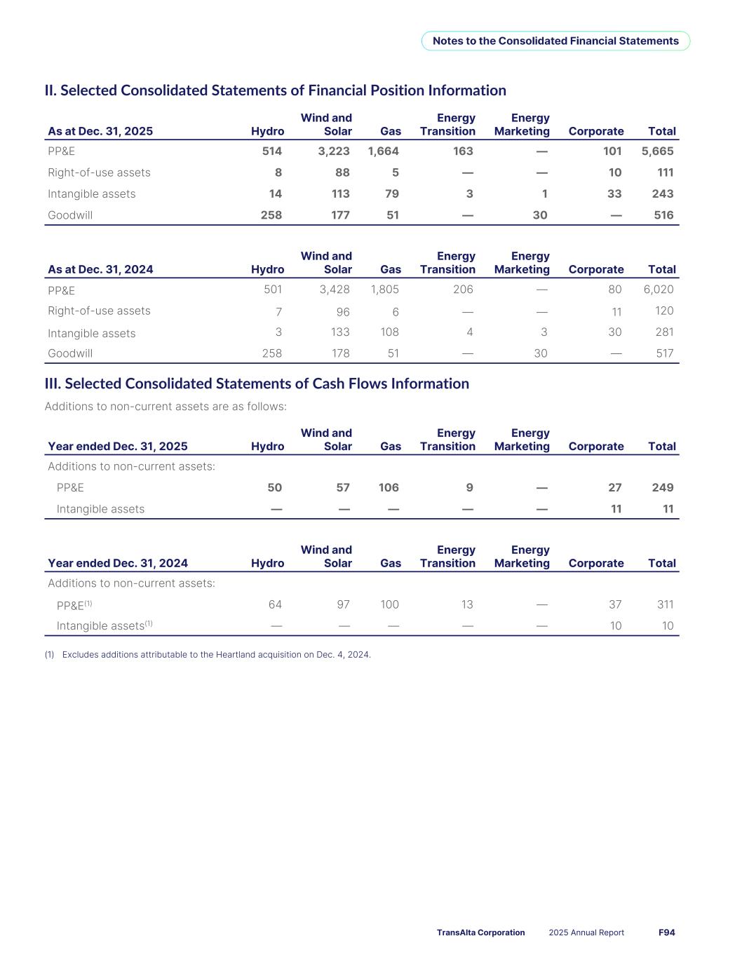 II. Selected Consolidated Statements of Financial Position Information As at Dec. 31, 2025 Hydro Wind and Solar Gas Energy Transition Energy Marketing Corporate Total PP&E 514 3,223 1,664 163 — 101 5,665 Right-of-use assets 8 88 5 — — 10 111 Intangible assets 14 113 79 3 1 33 243 Goodwill 258 177 51 — 30 — 516 As at Dec. 31, 2024 Hydro Wind and Solar Gas Energy Transition Energy Marketing Corporate Total PP&E 501 3,428 1,805 206 — 80 6,020 Right-of-use assets 7 96 6 — — 11 120 Intangible assets 3 133 108 4 3 30 281 Goodwill 258 178 51 — 30 — 517 III. Selected Consolidated Statements of Cash Flows Information Additions to non-current assets are as follows: Year ended Dec. 31, 2025 Hydro Wind and Solar Gas Energy Transition Energy Marketing Corporate Total Additions to non-current assets:           PP&E 50 57 106 9 — 27 249 Intangible assets — — — — — 11 11 Year ended Dec. 31, 2024 Hydro Wind and Solar Gas Energy Transition Energy Marketing Corporate Total Additions to non-current assets: PP&E(1) 64 97 100 13 — 37 311 Intangible assets(1) — — — — — 10 10 (1) Excludes additions attributable to the Heartland acquisition on Dec. 4, 2024. TransAlta Corporation 2025 Annual Report F94