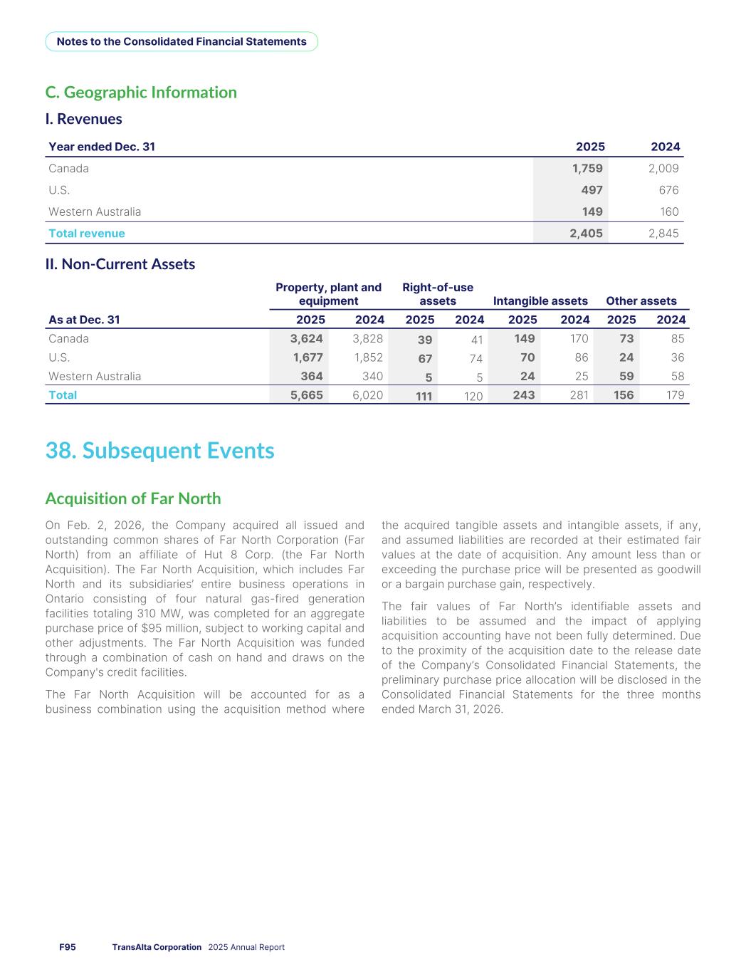 C. Geographic Information I. Revenues Year ended Dec. 31 2025 2024 Canada 1,759 2,009 U.S. 497 676 Western Australia 149 160 Total revenue 2,405 2,845 II. Non-Current Assets Property, plant and equipment Right-of-use assets Intangible assets Other assets As at Dec. 31 2025 2024 2025 2024 2025 2024 2025 2024 Canada 3,624 3,828 39 41 149 170 73 85 U.S. 1,677 1,852 67 74 70 86 24 36 Western Australia 364 340 5 5 24 25 59 58 Total 5,665 6,020 111 120 243 281 156 179 38. Subsequent Events Acquisition of Far North On Feb. 2, 2026, the Company acquired all issued and outstanding common shares of Far North Corporation (Far North) from an affiliate of Hut 8 Corp. (the Far North Acquisition). The Far North Acquisition, which includes Far North and its subsidiaries’ entire business operations in Ontario consisting of four natural gas-fired generation facilities totaling 310 MW, was completed for an aggregate purchase price of $95 million, subject to working capital and other adjustments. The Far North Acquisition was funded through a combination of cash on hand and draws on the Company's credit facilities. The Far North Acquisition will be accounted for as a business combination using the acquisition method where the acquired tangible assets and intangible assets, if any, and assumed liabilities are recorded at their estimated fair values at the date of acquisition. Any amount less than or exceeding the purchase price will be presented as goodwill or a bargain purchase gain, respectively. The fair values of Far North’s identifiable assets and liabilities to be assumed and the impact of applying acquisition accounting have not been fully determined. Due to the proximity of the acquisition date to the release date of the Company’s Consolidated Financial Statements, the preliminary purchase price allocation will be disclosed in the Consolidated Financial Statements for the three months ended March 31, 2026. F95 TransAlta Corporation 2025 Annual Report