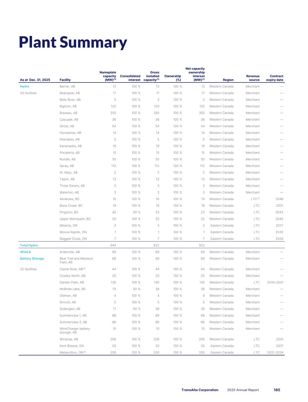 Plant Summary Hydro Barrier, AB 13 100 % 13 100 % 13 Western Canada Merchant — 24 facilities Bearspaw, AB 17 100 % 17 100 % 17 Western Canada Merchant — Belly River, AB 3 100 % 3 100 % 3 Western Canada Merchant — Bighorn, AB 120 100 % 120 100 % 120 Western Canada Merchant — Brazeau, AB 355 100 % 355 100 % 355 Western Canada Merchant — Cascade, AB 36 100 % 36 100 % 36 Western Canada Merchant — Ghost, AB 54 100 % 54 100 % 54 Western Canada Merchant — Horseshoe, AB 14 100 % 14 100 % 14 Western Canada Merchant — Interlakes, AB 5 100 % 5 100 % 5 Western Canada Merchant — Kananaskis, AB 19 100 % 19 100 % 19 Western Canada Merchant — Pocaterra, AB 15 100 % 15 100 % 15 Western Canada Merchant — Rundle, AB 50 100 % 50 100 % 50 Western Canada Merchant — Spray, AB 112 100 % 112 100 % 112 Western Canada Merchant — St. Mary, AB 2 100 % 2 100 % 2 Western Canada Merchant — Taylor, AB 13 100 % 13 100 % 13 Western Canada Merchant — Three Sisters, AB 3 100 % 3 100 % 3 Western Canada Merchant — Waterton, AB 3 100 % 3 100 % 3 Western Canada Merchant — Akolkolex, BC 10 100 % 10 100 % 10 Western Canada LTC(2) 2046 Bone Creek, BC 19 100 % 19 100 % 19 Western Canada LTC 2031 Pingston, BC 45 50 % 23 100 % 23 Western Canada LTC 2043 Upper Mamquam, BC 25 100 % 25 100 % 25 Western Canada LTC 2045 Misema, ON 3 100 % 3 100 % 3 Eastern Canada LTC 2027 Moose Rapids, ON 1 100 % 1 100 % 1 Eastern Canada LTC 2030 Ragged Chute, ON 7 100 % 7 100 % 7 Eastern Canada LTC 2029 Total Hydro 944 922 922 Wind & Ardenville, AB 69 100 % 69 100 % 69 Western Canada Merchant — Battery Storage Blue Trail and Macleod Flats, AB 69 100 % 69 100 % 69 Western Canada Merchant — 32 facilities Castle River, AB(3) 44 100 % 44 100 % 44 Western Canada Merchant — Cowley North, AB 20 100 % 20 100 % 20 Western Canada Merchant — Garden Plain, AB 130 100 % 130 100 % 130 Western Canada LTC 2034-2041 McBride Lake, AB 75 50 % 38 100 % 38 Western Canada Merchant — Oldman, AB 4 100 % 4 100 % 4 Western Canada Merchant — Sinnott, AB 5 100 % 5 100 % 5 Western Canada Merchant — Soderglen, AB 71 50 % 36 100 % 36 Western Canada Merchant — Summerview 1, AB 68 100 % 68 100 % 68 Western Canada Merchant — Summerview 2, AB 66 100 % 66 100 % 66 Western Canada Merchant — WindCharger battery storage, AB 10 100 % 10 100 % 10 Western Canada Merchant — Windrise, AB 206 100 % 206 100 % 206 Western Canada LTC 2041 Kent Breeze, ON 20 100 % 20 100 % 20 Eastern Canada LTC 2031 Melancthon, ON(4) 200 100 % 200 100 % 200 Eastern Canada LTC 2031-2034 As at Dec. 31, 2025 Facility Nameplate capacity (MW)(1) Consolidated interest Gross installed capacity(1) Ownership (%) Net capacity ownership interest (MW)(1) Region Revenue source Contract expiry date TransAlta Corporation 2025 Annual Report 185