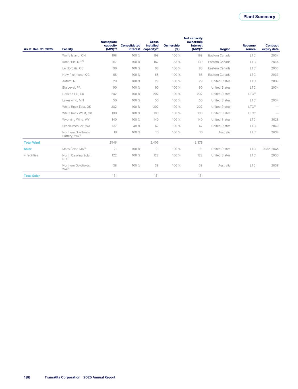 Wolfe Island, ON 198 100 % 198 100 % 198 Eastern Canada LTC 2034 Kent Hills, NB(5) 167 100 % 167 83 % 139 Eastern Canada LTC 2045 Le Nordais, QC 98 100 % 98 100 % 98 Eastern Canada LTC 2033 New Richmond, QC 68 100 % 68 100 % 68 Eastern Canada LTC 2033 Antrim, NH 29 100 % 29 100 % 29 United States LTC 2039 Big Level, PA 90 100 % 90 100 % 90 United States LTC 2034 Horizon Hill, OK 202 100 % 202 100 % 202 United States LTC11 — Lakeswind, MN 50 100 % 50 100 % 50 United States LTC 2034 White Rock East, OK 202 100 % 202 100 % 202 United States LTC11 — White Rock West, OK 100 100 % 100 100 % 100 United States LTC11 — Wyoming Wind, WY 140 100 % 140 100 % 140 United States LTC 2028 Skookumchuck, WA 137 49 % 67 100 % 67 United States LTC 2040 Northern Goldfields Battery, WA(8) 10 100 % 10 100 % 10 Australia LTC 2038 Total Wind 2548 2,406 2,378 Solar Mass Solar, MA(6) 21 100 % 21 100 % 21 United States LTC 2032-2045 4 facilities North Carolina Solar, NC(7) 122 100 % 122 100 % 122 United States LTC 2033 Northern Goldfields, WA(8) 38 100 % 38 100 % 38 Australia LTC 2038 Total Solar 181 181 181 As at Dec. 31, 2025 Facility Nameplate capacity (MW)(1) Consolidated interest Gross installed capacity(1) Ownership (%) Net capacity ownership interest (MW)(1) Region Revenue source Contract expiry date 186 TransAlta Corporation 2025 Annual Report
