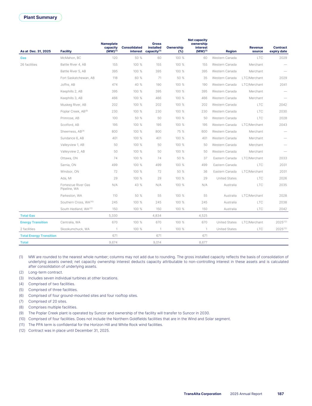 As at Dec. 31, 2025 Facility Nameplate capacity (MW)(1) Consolidated interest Gross installed capacity(1) Ownership (%) Net capacity ownership interest (MW)(1) Region Revenue source Contract expiry date Gas McMahon, BC 120 50 % 60 100 % 60 Western Canada LTC 2029 26 facilities Battle River 4, AB 155 100 % 155 100 % 155 Western Canada Merchant — Battle River 5, AB 395 100 % 395 100 % 395 Western Canada Merchant — Fort Saskatchewan, AB 118 60 % 71 50 % 35 Western Canada LTC/Merchant 2029 Joffre, AB 474 40 % 190 100 % 190 Western Canada LTC/Merchant 2041 Keephills 2, AB 395 100 % 395 100 % 395 Western Canada Merchant — Keephills 3, AB 466 100 % 466 100 % 466 Western Canada Merchant — Muskeg River, AB 202 100 % 202 100 % 202 Western Canada LTC 2042 Poplar Creek, AB(9) 230 100 % 230 100 % 230 Western Canada LTC 2030 Primrose, AB 100 50 % 50 100 % 50 Western Canada LTC 2028 Scotford, AB 195 100 % 195 100 % 195 Western Canada LTC/Merchant 2043 Sheerness, AB(4) 800 100 % 800 75 % 600 Western Canada Merchant — Sundance 6, AB 401 100 % 401 100 % 401 Western Canada Merchant — Valleyview 1, AB 50 100 % 50 100 % 50 Western Canada Merchant — Valleyview 2, AB 50 100 % 50 100 % 50 Western Canada Merchant — Ottawa, ON 74 100 % 74 50 % 37 Eastern Canada LTC/Merchant 2033 Sarnia, ON 499 100 % 499 100 % 499 Eastern Canada LTC 2031 Windsor, ON 72 100 % 72 50 % 36 Eastern Canada LTC/Merchant 2031 Ada, MI 29 100 % 29 100 % 29 United States LTC 2026 Fortescue River Gas Pipeline, WA N/A 43 % N/A 100 % N/A Australia LTC 2035 Parkeston, WA 110 50 % 55 100 % 55 Australia LTC/Merchant 2028 Southern Cross, WA(10) 245 100 % 245 100 % 245 Australia LTC 2038 South Hedland, WA(12) 150 100 % 150 100 % 150 Australia LTC 2042 Total Gas 5,330 4,834 4,525 Energy Transition Centralia, WA 670 100 % 670 100 % 670 United States LTC/Merchant 2025(12) 2 facilities Skookumchuck, WA 1 100 % 1 100 % 1 United States LTC 2025(12) Total Energy Transition 671 671 671 Total 9,674 9,014 8,677 (1) MW are rounded to the nearest whole number; columns may not add due to rounding. The gross installed capacity reflects the basis of consolidation of underlying assets owned; net capacity ownership interest deducts capacity attributable to non-controlling interest in these assets and is calculated after consolidation of underlying assets. (2) Long-term contract. (3) Includes seven individual turbines at other locations. (4) Comprised of two facilities. (5) Comprised of three facilities. (6) Comprised of four ground-mounted sites and four rooftop sites. (7) Comprised of 20 sites. (8) Comprises multiple facilities. (9) The Poplar Creek plant is operated by Suncor and ownership of the facility will transfer to Suncor in 2030. (10) Comprised of four facilities. Does not include the Northern Goldfields facilities that are in the Wind and Solar segment. (11) The PPA term is confidential for the Horizon Hill and White Rock wind facilities. (12) Contract was in place until December 31, 2025. TransAlta Corporation 2025 Annual Report 187