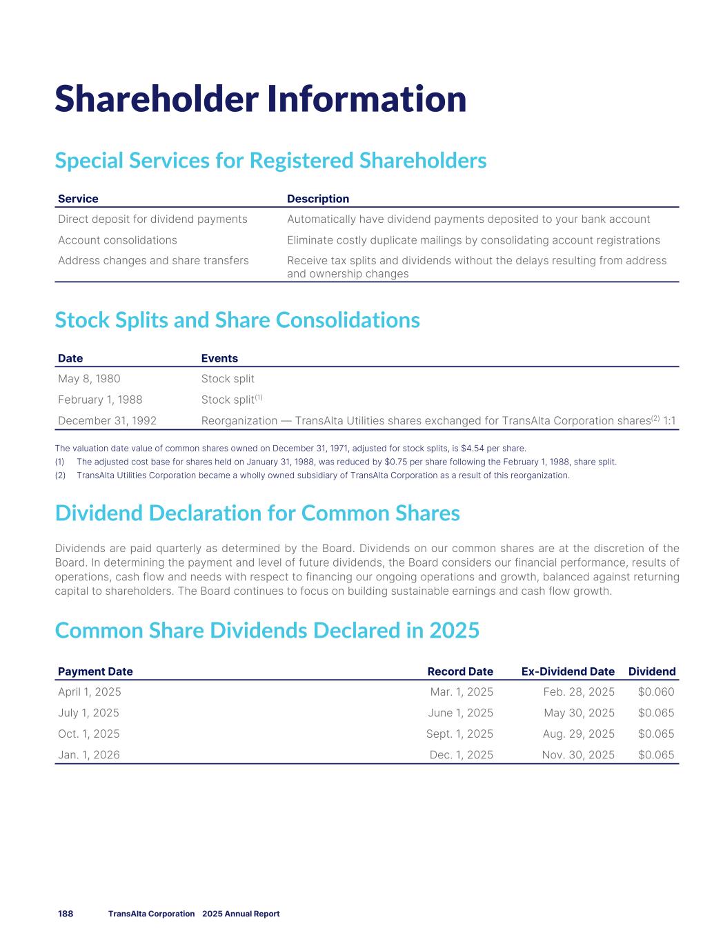 Shareholder Information Special Services for Registered Shareholders Service Description Direct deposit for dividend payments Automatically have dividend payments deposited to your bank account Account consolidations Eliminate costly duplicate mailings by consolidating account registrations Address changes and share transfers Receive tax splits and dividends without the delays resulting from address and ownership changes Stock Splits and Share Consolidations Date Events May 8, 1980 Stock split February 1, 1988 Stock split(1) December 31, 1992 Reorganization — TransAlta Utilities shares exchanged for TransAlta Corporation shares(2) 1:1 The valuation date value of common shares owned on December 31, 1971, adjusted for stock splits, is $4.54 per share. (1) The adjusted cost base for shares held on January 31, 1988, was reduced by $0.75 per share following the February 1, 1988, share split. (2) TransAlta Utilities Corporation became a wholly owned subsidiary of TransAlta Corporation as a result of this reorganization. Dividend Declaration for Common Shares Dividends are paid quarterly as determined by the Board. Dividends on our common shares are at the discretion of the Board. In determining the payment and level of future dividends, the Board considers our financial performance, results of operations, cash flow and needs with respect to financing our ongoing operations and growth, balanced against returning capital to shareholders. The Board continues to focus on building sustainable earnings and cash flow growth. Common Share Dividends Declared in 2025 Payment Date Record Date Ex-Dividend Date Dividend April 1, 2025 Mar. 1, 2025 Feb. 28, 2025 $0.060 July 1, 2025 June 1, 2025 May 30, 2025 $0.065 Oct. 1, 2025 Sept. 1, 2025 Aug. 29, 2025 $0.065 Jan. 1, 2026 Dec. 1, 2025 Nov. 30, 2025 $0.065 188 TransAlta Corporation 2025 Annual Report