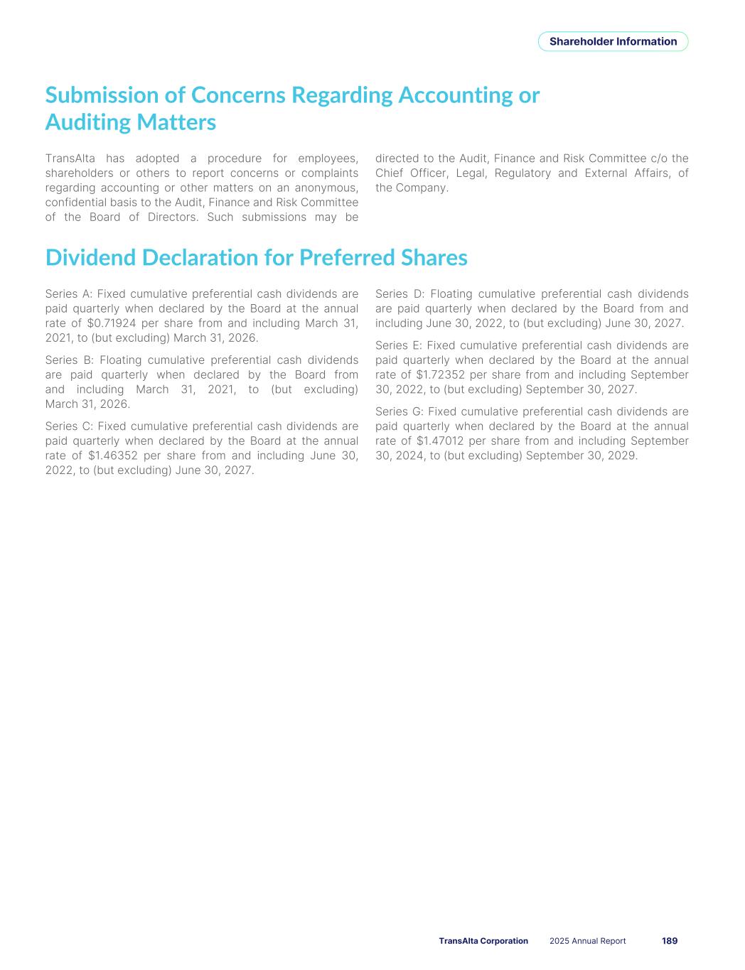 Submission of Concerns Regarding Accounting or Auditing Matters TransAlta has adopted a procedure for employees, shareholders or others to report concerns or complaints regarding accounting or other matters on an anonymous, confidential basis to the Audit, Finance and Risk Committee of the Board of Directors. Such submissions may be directed to the Audit, Finance and Risk Committee c/o the Chief Officer, Legal, Regulatory and External Affairs, of the Company. Dividend Declaration for Preferred Shares Series A: Fixed cumulative preferential cash dividends are paid quarterly when declared by the Board at the annual rate of $0.71924 per share from and including March 31, 2021, to (but excluding) March 31, 2026. Series B: Floating cumulative preferential cash dividends are paid quarterly when declared by the Board from and  including March 31, 2021, to (but excluding) March 31, 2026. Series C: Fixed cumulative preferential cash dividends are paid quarterly when declared by the Board at the annual rate of $1.46352 per share from and including June 30, 2022, to (but excluding) June 30, 2027. Series D: Floating cumulative preferential cash dividends are paid quarterly when declared by the Board from and including June 30, 2022, to (but excluding) June 30, 2027. Series E: Fixed cumulative preferential cash dividends are paid quarterly when declared by the Board at the annual rate of $1.72352 per share from and including September 30, 2022, to (but excluding) September 30, 2027. Series G: Fixed cumulative preferential cash dividends are paid quarterly when declared by the Board at the annual rate of $1.47012 per share from and including September 30, 2024, to (but excluding) September 30, 2029. TransAlta Corporation 2025 Annual Report 189