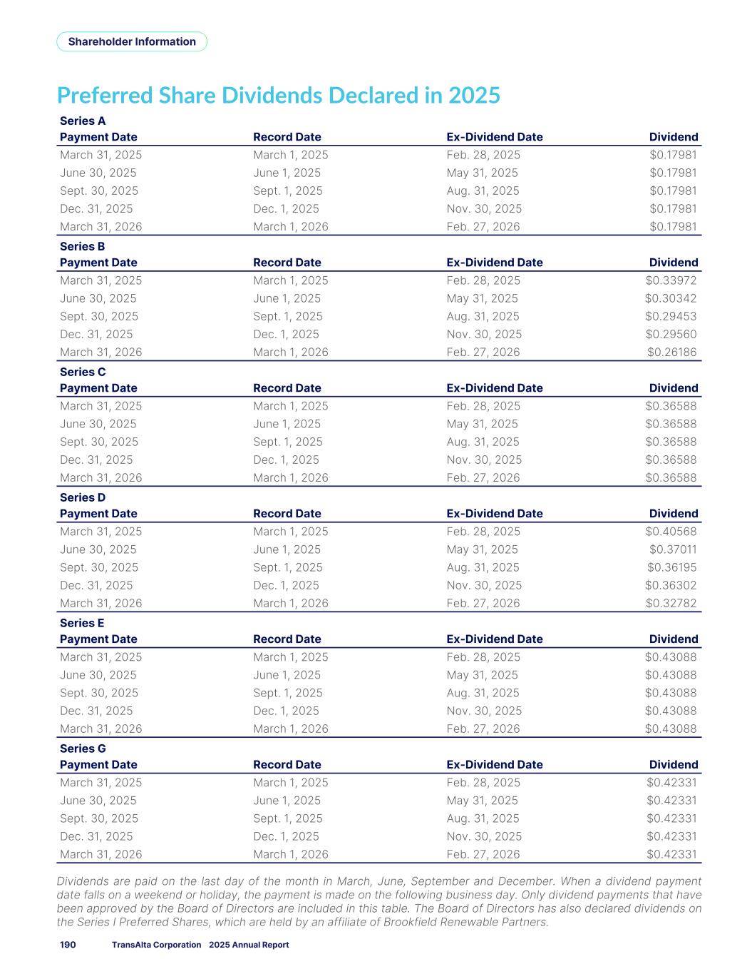 Preferred Share Dividends Declared in 2025 Series A Payment Date Record Date Ex-Dividend Date Dividend March 31, 2025 March 1, 2025 Feb. 28, 2025 $0.17981 June 30, 2025 June 1, 2025 May 31, 2025 $0.17981 Sept. 30, 2025 Sept. 1, 2025 Aug. 31, 2025 $0.17981 Dec. 31, 2025 Dec. 1, 2025 Nov. 30, 2025 $0.17981 March 31, 2026 March 1, 2026 Feb. 27, 2026 $0.17981 Series B Payment Date Record Date Ex-Dividend Date Dividend March 31, 2025 March 1, 2025 Feb. 28, 2025 $0.33972 June 30, 2025 June 1, 2025 May 31, 2025 $0.30342 Sept. 30, 2025 Sept. 1, 2025 Aug. 31, 2025 $0.29453 Dec. 31, 2025 Dec. 1, 2025 Nov. 30, 2025 $0.29560 March 31, 2026 March 1, 2026 Feb. 27, 2026 $0.26186 Series C Payment Date Record Date Ex-Dividend Date Dividend March 31, 2025 March 1, 2025 Feb. 28, 2025 $0.36588 June 30, 2025 June 1, 2025 May 31, 2025 $0.36588 Sept. 30, 2025 Sept. 1, 2025 Aug. 31, 2025 $0.36588 Dec. 31, 2025 Dec. 1, 2025 Nov. 30, 2025 $0.36588 March 31, 2026 March 1, 2026 Feb. 27, 2026 $0.36588 Series D Payment Date Record Date Ex-Dividend Date Dividend March 31, 2025 March 1, 2025 Feb. 28, 2025 $0.40568 June 30, 2025 June 1, 2025 May 31, 2025 $0.37011 Sept. 30, 2025 Sept. 1, 2025 Aug. 31, 2025 $0.36195 Dec. 31, 2025 Dec. 1, 2025 Nov. 30, 2025 $0.36302 March 31, 2026 March 1, 2026 Feb. 27, 2026 $0.32782 Series E Payment Date Record Date Ex-Dividend Date Dividend March 31, 2025 March 1, 2025 Feb. 28, 2025 $0.43088 June 30, 2025 June 1, 2025 May 31, 2025 $0.43088 Sept. 30, 2025 Sept. 1, 2025 Aug. 31, 2025 $0.43088 Dec. 31, 2025 Dec. 1, 2025 Nov. 30, 2025 $0.43088 March 31, 2026 March 1, 2026 Feb. 27, 2026 $0.43088 Series G Payment Date Record Date Ex-Dividend Date Dividend March 31, 2025 March 1, 2025 Feb. 28, 2025 $0.42331 June 30, 2025 June 1, 2025 May 31, 2025 $0.42331 Sept. 30, 2025 Sept. 1, 2025 Aug. 31, 2025 $0.42331 Dec. 31, 2025 Dec. 1, 2025 Nov. 30, 2025 $0.42331 March 31, 2026 March 1, 2026 Feb. 27, 2026 $0.42331 Dividends are paid on the last day of the month in March, June, September and December. When a dividend payment date falls on a weekend or holiday, the payment is made on the following business day. Only dividend payments that have been approved by the Board of Directors are included in this table. The Board of Directors has also declared dividends on the Series I Preferred Shares, which are held by an affiliate of Brookfield Renewable Partners. 190 TransAlta Corporation 2025 Annual Report