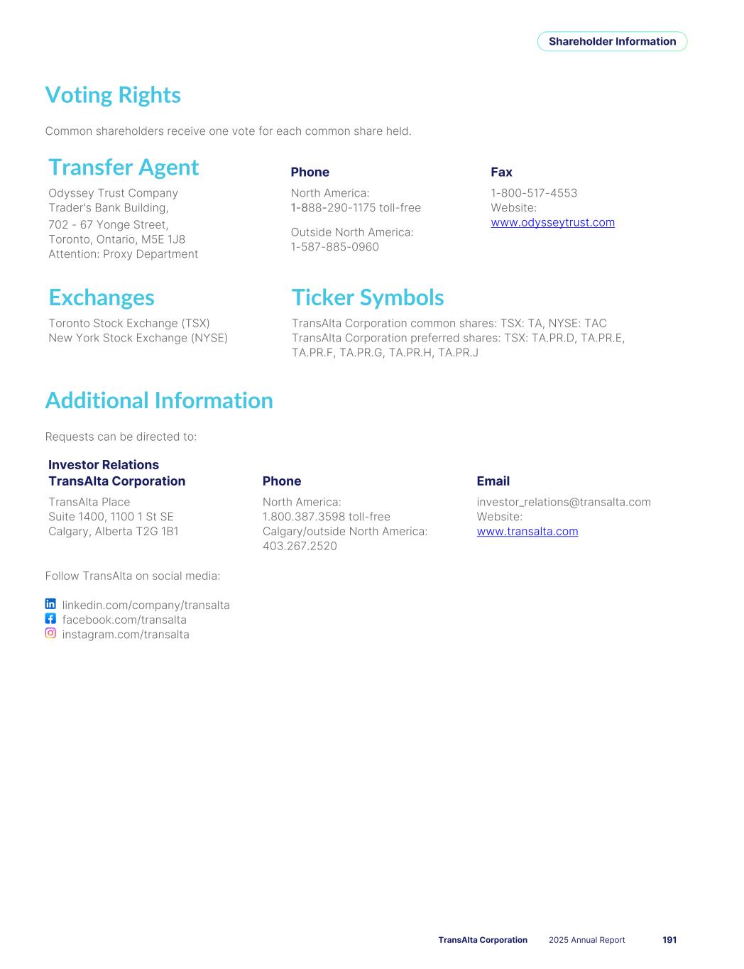Voting Rights Common shareholders receive one vote for each common share held. Transfer Agent Phone Fax Odyssey Trust Company Trader's Bank Building, 702 - 67 Yonge Street, Toronto, Ontario, M5E 1J8 Attention: Proxy Department North America: 1-888-290-1175 toll-free Outside North America: 1-587-885-0960 1-800-517-4553 Website: www.odysseytrust.com Exchanges Ticker Symbols Toronto Stock Exchange (TSX) New York Stock Exchange (NYSE) TransAlta Corporation common shares: TSX: TA, NYSE: TAC TransAlta Corporation preferred shares: TSX: TA.PR.D, TA.PR.E, TA.PR.F, TA.PR.G, TA.PR.H, TA.PR.J Additional Information Requests can be directed to: Investor Relations TransAlta Corporation Phone Email TransAlta Place Suite 1400, 1100 1 St SE Calgary, Alberta T2G 1B1 North America: 1.800.387.3598 toll-free Calgary/outside North America: 403.267.2520 investor_relations@transalta.com Website: www.transalta.com Follow TransAlta on social media: linkedin.com/company/transalta facebook.com/transalta instagram.com/transalta TransAlta Corporation 2025 Annual Report 191