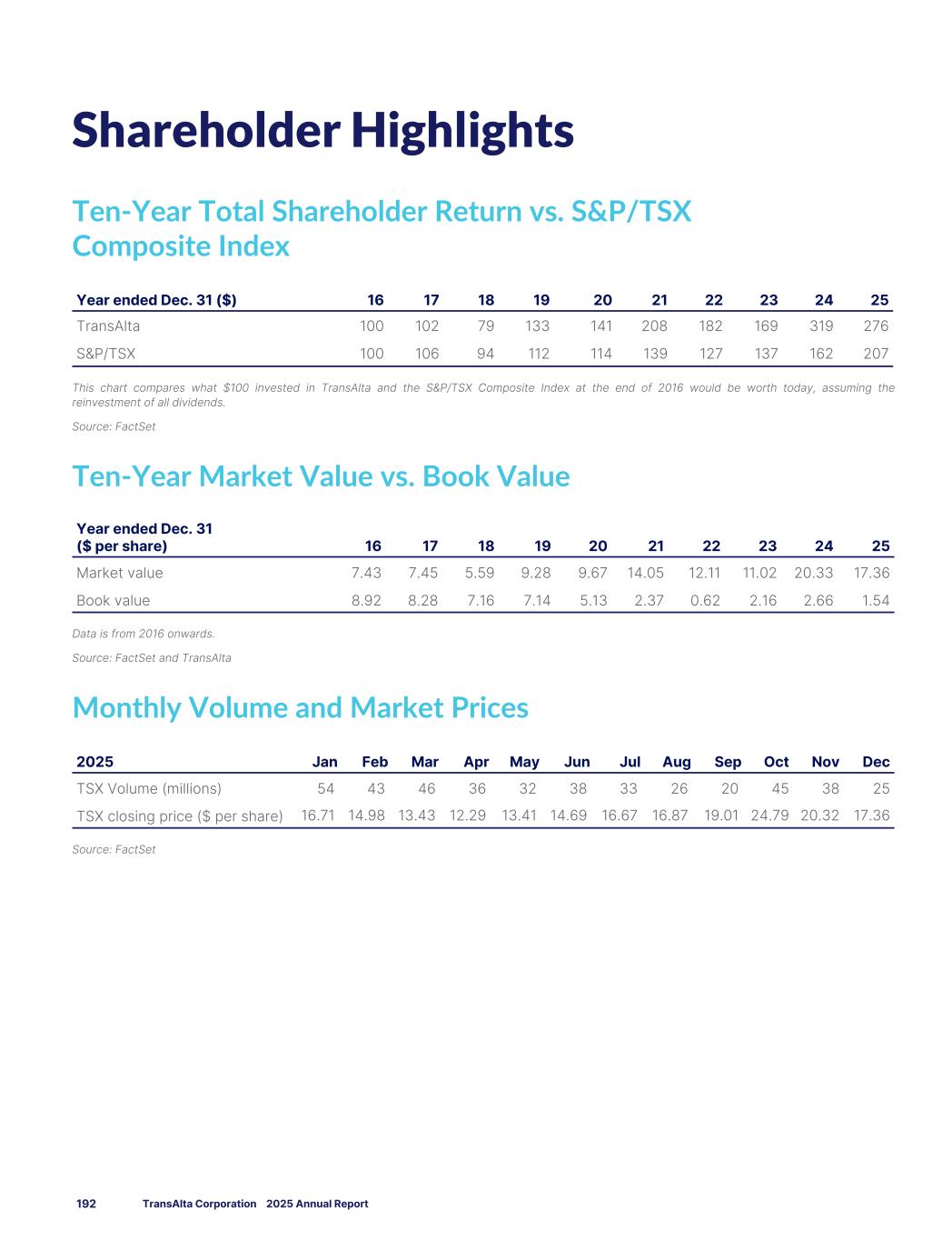 Shareholder Highlights Ten-Year Total Shareholder Return vs. S&P/TSX Composite Index Year ended Dec. 31 ($) 16 17 18 19 20 21 22 23 24 25 TransAlta 100 102 79 133 141 208 182 169 319 276 S&P/TSX 100 106 94 112 114 139 127 137 162 207 This chart compares what $100 invested in TransAlta and the S&P/TSX Composite Index at the end of 2016 would be worth today, assuming the reinvestment of all dividends. Source: FactSet Ten-Year Market Value vs. Book Value Year ended Dec. 31 ($ per share) 16 17 18 19 20 21 22 23 24 25 Market value 7.43 7.45 5.59 9.28 9.67 14.05 12.11 11.02 20.33 17.36 Book value 8.92 8.28 7.16 7.14 5.13 2.37 0.62 2.16 2.66 1.54 Data is from 2016 onwards. Source: FactSet and TransAlta Monthly Volume and Market Prices 2025 Jan Feb Mar Apr May Jun Jul Aug Sep Oct Nov Dec TSX Volume (millions) 54 43 46 36 32 38 33 26 20 45 38 25 TSX closing price ($ per share) 16.71 14.98 13.43 12.29 13.41 14.69 16.67 16.87 19.01 24.79 20.32 17.36 Source: FactSet 192 TransAlta Corporation 2025 Annual Report