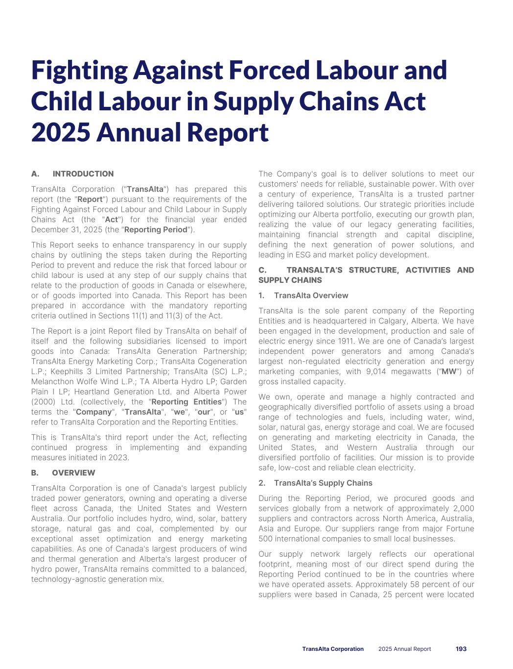 Fighting Against Forced Labour and Child Labour in Supply Chains Act 2025 Annual Report A. INTRODUCTION TransAlta Corporation ("TransAlta") has prepared this report (the "Report") pursuant to the requirements of the Fighting Against Forced Labour and Child Labour in Supply Chains Act (the "Act") for the financial year ended December 31, 2025 (the "Reporting Period"). This Report seeks to enhance transparency in our supply chains by outlining the steps taken during the Reporting Period to prevent and reduce the risk that forced labour or child labour is used at any step of our supply chains that relate to the production of goods in Canada or elsewhere, or of goods imported into Canada. This Report has been prepared in accordance with the mandatory reporting criteria outlined in Sections 11(1) and 11(3) of the Act. The Report is a joint Report filed by TransAlta on behalf of itself and the following subsidiaries licensed to import goods into Canada: TransAlta Generation Partnership; TransAlta Energy Marketing Corp.; TransAlta Cogeneration L.P.; Keephills 3 Limited Partnership; TransAlta (SC) L.P.; Melancthon Wolfe Wind L.P.; TA Alberta Hydro LP; Garden Plain I LP; Heartland Generation Ltd. and Alberta Power (2000) Ltd. (collectively, the "Reporting Entities") The terms the "Company", "TransAlta", "we", "our", or "us" refer to TransAlta Corporation and the Reporting Entities. This is TransAlta's third report under the Act, reflecting continued progress in implementing and expanding measures initiated in 2023. B. OVERVIEW TransAlta Corporation is one of Canada's largest publicly traded power generators, owning and operating a diverse fleet across Canada, the United States and Western Australia. Our portfolio includes hydro, wind, solar, battery storage, natural gas and coal, complemented by our exceptional asset optimization and energy marketing capabilities. As one of Canada's largest producers of wind and thermal generation and Alberta's largest producer of hydro power, TransAlta remains committed to a balanced, technology-agnostic generation mix. The Company's goal is to deliver solutions to meet our customers' needs for reliable, sustainable power. With over a century of experience, TransAlta is a trusted partner delivering tailored solutions. Our strategic priorities include optimizing our Alberta portfolio, executing our growth plan, realizing the value of our legacy generating facilities, maintaining financial strength and capital discipline, defining the next generation of power solutions, and leading in ESG and market policy development. C. TRANSALTA’S STRUCTURE, ACTIVITIES AND SUPPLY CHAINS 1. TransAlta Overview TransAlta is the sole parent company of the Reporting Entities and is headquartered in Calgary, Alberta. We have been engaged in the development, production and sale of electric energy since 1911. We are one of Canada’s largest independent power generators and among Canada’s largest non-regulated electricity generation and energy marketing companies, with 9,014 megawatts (“MW”) of gross installed capacity. We own, operate and manage a highly contracted and geographically diversified portfolio of assets using a broad range of technologies and fuels, including water, wind, solar, natural gas, energy storage and coal. We are focused on generating and marketing electricity in Canada, the United States, and Western Australia through our diversified portfolio of facilities. Our mission is to provide safe, low-cost and reliable clean electricity. 2. TransAlta’s Supply Chains During the Reporting Period, we procured goods and services globally from a network of approximately 2,000 suppliers and contractors across North America, Australia, Asia and Europe. Our suppliers range from major Fortune 500 international companies to small local businesses. Our supply network largely reflects our operational footprint, meaning most of our direct spend during the Reporting Period continued to be in the countries where we have operated assets. Approximately 58 percent of our suppliers were based in Canada, 25 percent were located TransAlta Corporation 2025 Annual Report 193