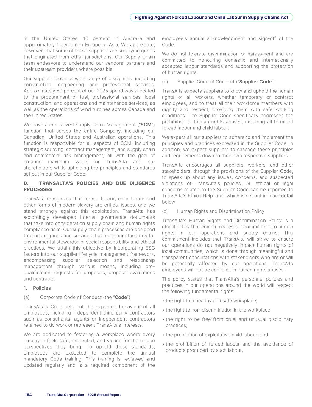 in the United States, 16 percent in Australia and approximately 1 percent in Europe or Asia. We appreciate, however, that some of these suppliers are supplying goods that originated from other jurisdictions. Our Supply Chain team endeavors to understand our vendors’ partners and their upstream providers where possible. Our suppliers cover a wide range of disciplines, including construction, engineering and professional services. Approximately 80 percent of our 2025 spend was allocated to the procurement of fuel, professional services, local construction, and operations and maintenance services, as well as the operations of wind turbines across Canada and the United States. We have a centralized Supply Chain Management (“SCM”) function that serves the entire Company, including our Canadian, United States and Australian operations. This function is responsible for all aspects of SCM, including strategic sourcing, contract management, and supply chain and commercial risk management, all with the goal of creating maximum value for TransAlta and our shareholders while upholding the principles and standards set out in our Supplier Code. D. TRANSALTA'S POLICIES AND DUE DILIGENCE PROCESSES TransAlta recognizes that forced labour, child labour and other forms of modern slavery are critical issues, and we stand strongly against this exploitation. TransAlta has accordingly developed internal governance documents that take into consideration supply chain and human rights compliance risks. Our supply chain processes are designed to procure goods and services that meet our standards for environmental stewardship, social responsibility and ethical practices. We attain this objective by incorporating ESG factors into our supplier lifecycle management framework, encompassing supplier selection and relationship management through various means, including pre- qualification, requests for proposals, proposal evaluations and contracts. 1. Policies (a) Corporate Code of Conduct (the “Code”) TransAlta's Code sets out the expected behaviour of all employees, including independent third-party contractors such as consultants, agents or independent contractors retained to do work or represent TransAlta's interests. We are dedicated to fostering a workplace where every employee feels safe, respected, and valued for the unique perspectives they bring. To uphold these standards, employees are expected to complete the annual mandatory Code training. This training is reviewed and updated regularly and is a required component of the employee's annual acknowledgment and sign-off of the Code. We do not tolerate discrimination or harassment and are committed to honouring domestic and internationally accepted labour standards and supporting the protection of human rights. (b) Supplier Code of Conduct (“Supplier Code”) TransAlta expects suppliers to know and uphold the human rights of all workers, whether temporary or contract employees, and to treat all their workforce members with dignity and respect, providing them with safe working conditions. The Supplier Code specifically addresses the prohibition of human rights abuses, including all forms of forced labour and child labour. We expect all our suppliers to adhere to and implement the principles and practices expressed in the Supplier Code. In addition, we expect suppliers to cascade these principles and requirements down to their own respective suppliers. TransAlta encourages all suppliers, workers, and other stakeholders, through the provisions of the Supplier Code, to speak up about any issues, concerns, and suspected violations of TransAlta's policies. All ethical or legal concerns related to the Supplier Code can be reported to TransAlta's Ethics Help Line, which is set out in more detail below. (c) Human Rights and Discrimination Policy TransAlta's Human Rights and Discrimination Policy is a global policy that communicates our commitment to human rights in our operations and supply chains. This commitment includes that TransAlta will strive to ensure our operations do not negatively impact human rights of local communities, which is done through meaningful and transparent consultations with stakeholders who are or will be potentially affected by our operations. TransAlta employees will not be complicit in human rights abuses. The policy states that TransAlta’s personnel policies and practices in our operations around the world will respect the following fundamental rights: • the right to a healthy and safe workplace; • the right to non-discrimination in the workplace; • the right to be free from cruel and unusual disciplinary practices; • the prohibition of exploitative child labour; and • the prohibition of forced labour and the avoidance of products produced by such labour. 194 TransAlta Corporation 2025 Annual Report