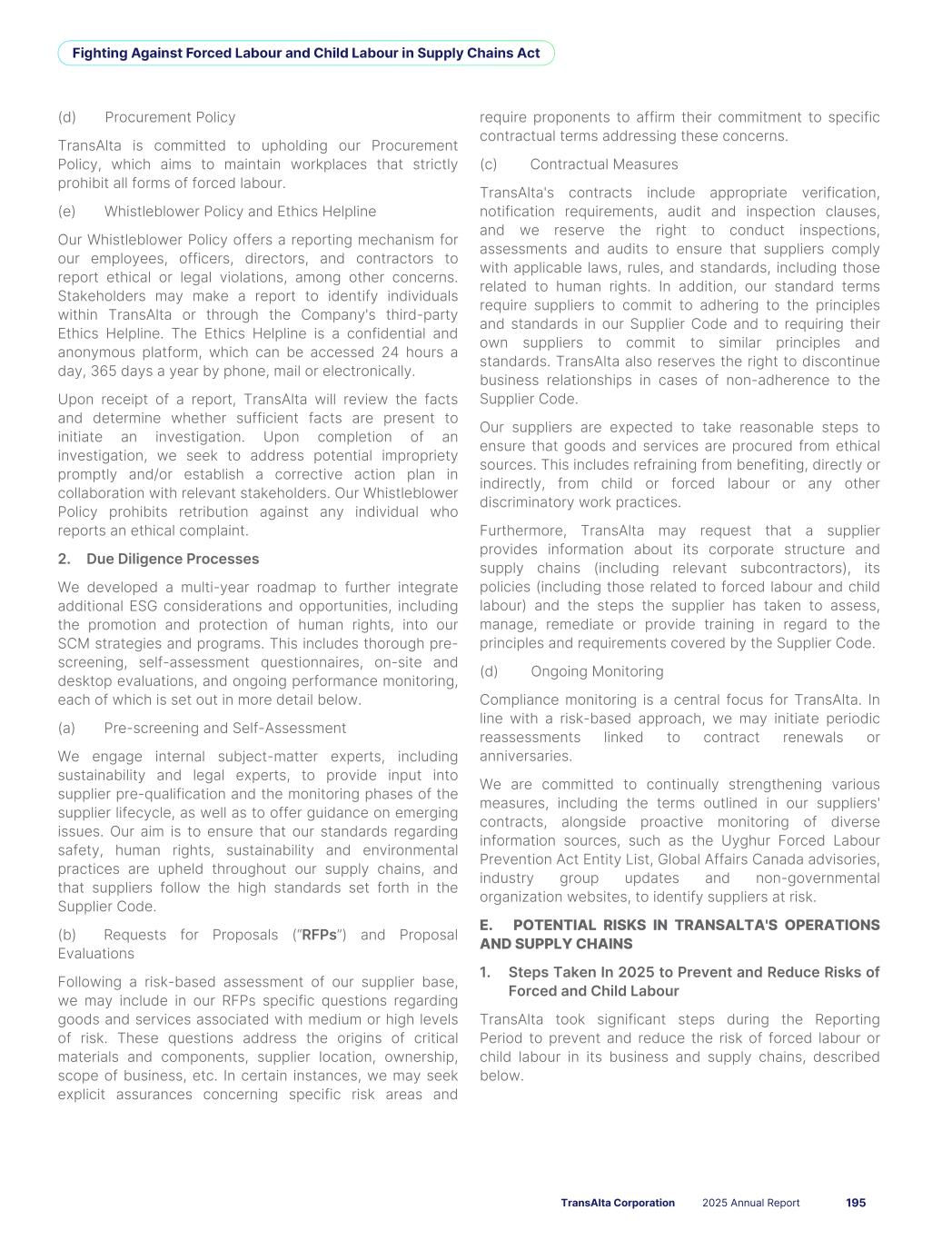 (d) Procurement Policy TransAlta is committed to upholding our Procurement Policy, which aims to maintain workplaces that strictly prohibit all forms of forced labour. (e) Whistleblower Policy and Ethics Helpline Our Whistleblower Policy offers a reporting mechanism for our employees, officers, directors, and contractors to report ethical or legal violations, among other concerns. Stakeholders may make a report to identify individuals within TransAlta or through the Company's third-party Ethics Helpline. The Ethics Helpline is a confidential and anonymous platform, which can be accessed 24 hours a day, 365 days a year by phone, mail or electronically. Upon receipt of a report, TransAlta will review the facts and determine whether sufficient facts are present to initiate an investigation. Upon completion of an investigation, we seek to address potential impropriety promptly and/or establish a corrective action plan in collaboration with relevant stakeholders. Our Whistleblower Policy prohibits retribution against any individual who reports an ethical complaint. 2. Due Diligence Processes We developed a multi-year roadmap to further integrate additional ESG considerations and opportunities, including the promotion and protection of human rights, into our SCM strategies and programs. This includes thorough pre- screening, self-assessment questionnaires, on-site and desktop evaluations, and ongoing performance monitoring, each of which is set out in more detail below. (a) Pre-screening and Self-Assessment We engage internal subject-matter experts, including sustainability and legal experts, to provide input into supplier pre-qualification and the monitoring phases of the supplier lifecycle, as well as to offer guidance on emerging issues. Our aim is to ensure that our standards regarding safety, human rights, sustainability and environmental practices are upheld throughout our supply chains, and that suppliers follow the high standards set forth in the Supplier Code. (b) Requests for Proposals (“RFPs”) and Proposal Evaluations Following a risk-based assessment of our supplier base, we may include in our RFPs specific questions regarding goods and services associated with medium or high levels of risk. These questions address the origins of critical materials and components, supplier location, ownership, scope of business, etc. In certain instances, we may seek explicit assurances concerning specific risk areas and require proponents to affirm their commitment to specific contractual terms addressing these concerns. (c) Contractual Measures TransAlta's contracts include appropriate verification, notification requirements, audit and inspection clauses, and we reserve the right to conduct inspections, assessments and audits to ensure that suppliers comply with applicable laws, rules, and standards, including those related to human rights. In addition, our standard terms require suppliers to commit to adhering to the principles and standards in our Supplier Code and to requiring their own suppliers to commit to similar principles and standards. TransAlta also reserves the right to discontinue business relationships in cases of non-adherence to the Supplier Code. Our suppliers are expected to take reasonable steps to ensure that goods and services are procured from ethical sources. This includes refraining from benefiting, directly or indirectly, from child or forced labour or any other discriminatory work practices. Furthermore, TransAlta may request that a supplier provides information about its corporate structure and supply chains (including relevant subcontractors), its policies (including those related to forced labour and child labour) and the steps the supplier has taken to assess, manage, remediate or provide training in regard to the principles and requirements covered by the Supplier Code. (d) Ongoing Monitoring Compliance monitoring is a central focus for TransAlta. In line with a risk-based approach, we may initiate periodic reassessments linked to contract renewals or anniversaries. We are committed to continually strengthening various measures, including the terms outlined in our suppliers' contracts, alongside proactive monitoring of diverse information sources, such as the Uyghur Forced Labour Prevention Act Entity List, Global Affairs Canada advisories, industry group updates and non-governmental organization websites, to identify suppliers at risk. E. POTENTIAL RISKS IN TRANSALTA'S OPERATIONS AND SUPPLY CHAINS 1. Steps Taken In 2025 to Prevent and Reduce Risks of Forced and Child Labour TransAlta took significant steps during the Reporting Period to prevent and reduce the risk of forced labour or child labour in its business and supply chains, described below. TransAlta Corporation 2025 Annual Report 195