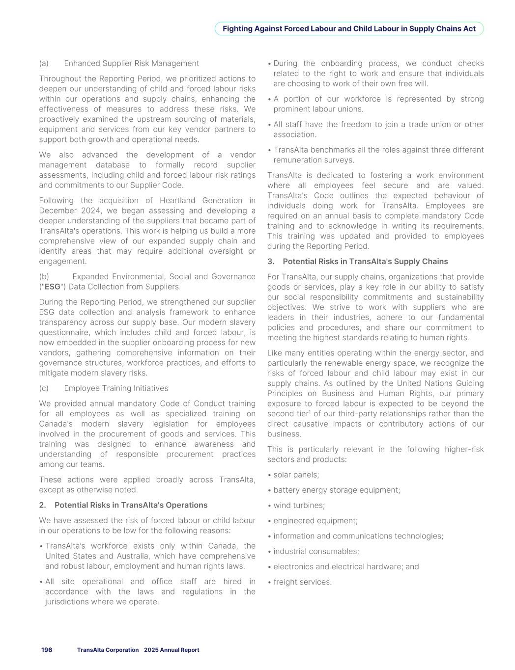 (a) Enhanced Supplier Risk Management Throughout the Reporting Period, we prioritized actions to deepen our understanding of child and forced labour risks within our operations and supply chains, enhancing the effectiveness of measures to address these risks. We proactively examined the upstream sourcing of materials, equipment and services from our key vendor partners to support both growth and operational needs. We also advanced the development of a vendor management database to formally record supplier assessments, including child and forced labour risk ratings and commitments to our Supplier Code. Following the acquisition of Heartland Generation in December 2024, we began assessing and developing a deeper understanding of the suppliers that became part of TransAlta's operations. This work is helping us build a more comprehensive view of our expanded supply chain and identify areas that may require additional oversight or engagement. (b) Expanded Environmental, Social and Governance ("ESG") Data Collection from Suppliers During the Reporting Period, we strengthened our supplier ESG data collection and analysis framework to enhance transparency across our supply base. Our modern slavery questionnaire, which includes child and forced labour, is now embedded in the supplier onboarding process for new vendors, gathering comprehensive information on their governance structures, workforce practices, and efforts to mitigate modern slavery risks. (c) Employee Training Initiatives We provided annual mandatory Code of Conduct training for all employees as well as specialized training on Canada's modern slavery legislation for employees involved in the procurement of goods and services. This training was designed to enhance awareness and understanding of responsible procurement practices among our teams. These actions were applied broadly across TransAlta, except as otherwise noted. 2. Potential Risks in TransAlta's Operations We have assessed the risk of forced labour or child labour in our operations to be low for the following reasons: • TransAlta’s workforce exists only within Canada, the United States and Australia, which have comprehensive and robust labour, employment and human rights laws. • All site operational and office staff are hired in accordance with the laws and regulations in the jurisdictions where we operate. • During the onboarding process, we conduct checks related to the right to work and ensure that individuals are choosing to work of their own free will. • A portion of our workforce is represented by strong prominent labour unions. • All staff have the freedom to join a trade union or other association. • TransAlta benchmarks all the roles against three different remuneration surveys. TransAlta is dedicated to fostering a work environment where all employees feel secure and are valued. TransAlta's Code outlines the expected behaviour of individuals doing work for TransAlta. Employees are required on an annual basis to complete mandatory Code training and to acknowledge in writing its requirements. This training was updated and provided to employees during the Reporting Period. 3. Potential Risks in TransAlta's Supply Chains For TransAlta, our supply chains, organizations that provide goods or services, play a key role in our ability to satisfy our social responsibility commitments and sustainability objectives. We strive to work with suppliers who are leaders in their industries, adhere to our fundamental policies and procedures, and share our commitment to meeting the highest standards relating to human rights. Like many entities operating within the energy sector, and particularly the renewable energy space, we recognize the risks of forced labour and child labour may exist in our supply chains. As outlined by the United Nations Guiding Principles on Business and Human Rights, our primary exposure to forced labour is expected to be beyond the second tier1 of our third-party relationships rather than the direct causative impacts or contributory actions of our business. This is particularly relevant in the following higher-risk sectors and products: • solar panels; • battery energy storage equipment; • wind turbines; • engineered equipment; • information and communications technologies; • industrial consumables; • electronics and electrical hardware; and • freight services. 196 TransAlta Corporation 2025 Annual Report
