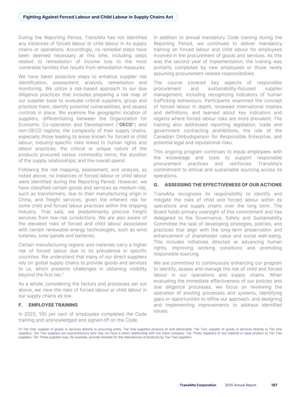 During the Reporting Period, TransAlta has not identified any instances of forced labour or child labour in its supply chains or operations. Accordingly, no remedial steps have been deemed necessary at this time, including steps related to remediation of income loss to the most vulnerable families that results from remediation measures. We have taken proactive steps to enhance supplier risk identification, assessment, analysis, remediation and monitoring. We utilize a risk-based approach to our due diligence practices that includes preparing a risk map of our supplier base to evaluate critical suppliers, group and prioritize them, identify potential vulnerabilities, and assess controls in place. We examine the geographic location of suppliers, differentiating between the Organization for Economic Co-operation and Development ("OECD") and non-OECD regions; the complexity of their supply chains, especially those leading to areas known for forced or child labour; industry-specific risks linked to human rights and labour practices; the critical or unique nature of the products procured versus commodity items; the duration of the supply relationships; and the overall spend. Following the risk mapping, assessment, and analysis, as noted above, no instances of forced labour or child labour were identified during the Reporting Period. However, we have classified certain goods and services as medium risk, such as transformers, due to their manufacturing origin in China, and freight services, given the inherent risk for some child and forced labour practices within the shipping industry. That said, we predominantly procure freight services from low-risk jurisdictions. We are also aware of the elevated risks of forced and child labour associated with certain renewable energy technologies, such as wind turbines, solar panels and batteries. Certain manufacturing regions and materials carry a higher risk of forced labour due to its prevalence in specific countries. We understand that many of our direct suppliers rely on global supply chains to provide goods and services to us, which presents challenges in obtaining visibility beyond the first tier.1 As a whole, considering the factors and processes set out above, we view the risks of forced labour or child labour in our supply chains as low. F. EMPLOYEE TRAINING In 2025, 100 per cent of employees completed the Code training and acknowledged and signed off on the Code. In addition to annual mandatory Code training during the Reporting Period, we continued to deliver mandatory training on forced labour and child labour for employees involved in the procurement of goods and services. As this was the second year of implementation, the training was primarily completed by new employees or those newly assuming procurement-related responsibilities. The course covered key aspects of responsible procurement and sustainability-focused supplier management, including recognizing indicators of human trafficking behaviours. Participants examined the concept of forced labour in depth, reviewed international treaties and definitions, and learned about key indicators and regions where forced labour risks are more prevalent. The training also addressed reporting legislation, trade and government contracting prohibitions, the role of the Canadian Ombudsperson for Responsible Enterprise, and potential legal and reputational risks. This ongoing program continues to equip employees with the knowledge and tools to support responsible procurement practices and reinforces TransAlta's commitment to ethical and sustainable sourcing across its operations. G. ASSESSING THE EFFECTIVENESS OF OUR ACTIONS TransAlta recognizes its responsibility to identify and mitigate the risks of child and forced labour within its operations and supply chains over the long term. The Board holds primary oversight of this commitment and has delegated to the Governance, Safety and Sustainability Committee the task of developing strategies, policies, and practices that align with the long-term preservation and enhancement of shareholder value and social well-being. This includes initiatives directed at advancing human rights, improving working conditions and promoting responsible sourcing. We are committed to continuously enhancing our program to identify, assess and manage the risk of child and forced labour in our operations and supply chains. When evaluating the immediate effectiveness of our policies and due diligence processes, we focus on reviewing the operation of existing processes and systems, identifying gaps or opportunities to refine our approach, and designing and implementing improvements to address identified issues. (1) Tier One: supplier of goods or services directly to procuring entity. Tier One suppliers produce an end deliverable. Tier Two: supplier of goods or services directly to Tier One suppliers. Tier Two suppliers are subcontractors who may not have a direct relationship with the client company. Tier Three: suppliers of raw material or base product to Tier Two suppliers. Tier Three suppliers may, for example, provide minerals for the manufacture of products by Tier Two suppliers. TransAlta Corporation 2025 Annual Report 197