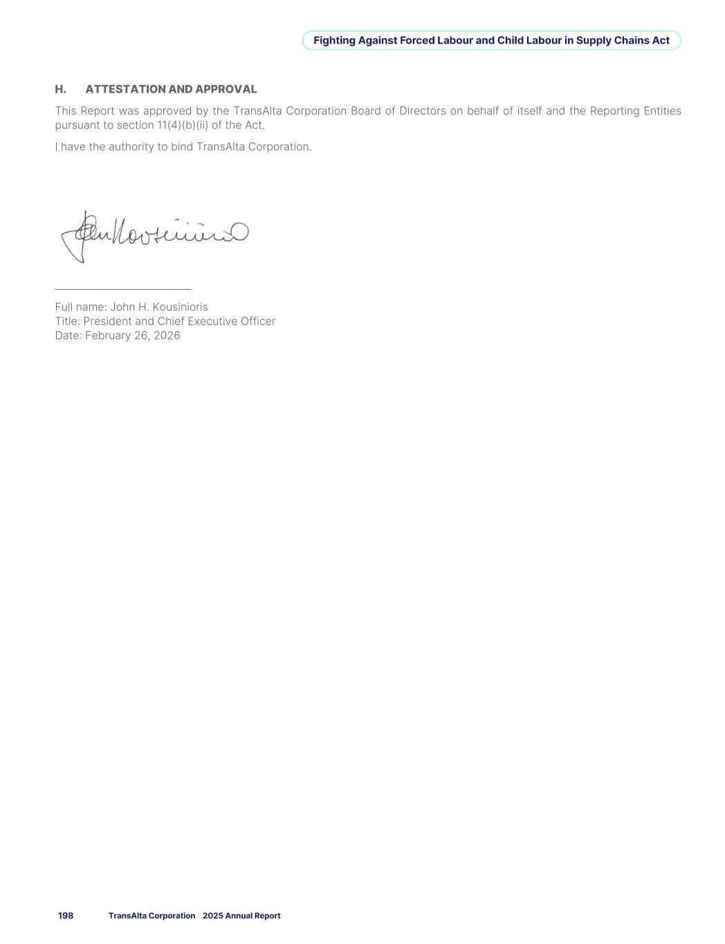H. ATTESTATION AND APPROVAL This Report was approved by the TransAlta Corporation Board of Directors on behalf of itself and the Reporting Entities pursuant to section 11(4)(b)(ii) of the Act. I have the authority to bind TransAlta Corporation. ____________________________ Full name: John H. Kousinioris Title: President and Chief Executive Officer Date: February 26, 2026 198 TransAlta Corporation 2025 Annual Report